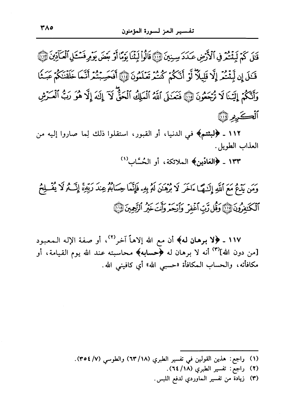133 - {العادين} الملائكة، أو الحساب. {ومن يدع مع الله إلهاً ءاخر لا برهان له به فإنّما حسابه عند ربّه إنّه لا يفلح الكافرون وقل ربّ اغفر وارحم وأنت خير الراحمين}