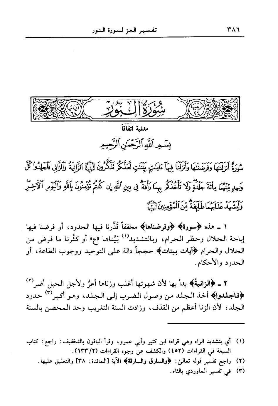 {سورة أنزلناها وفرضناها وانزلنا فيها ءايات بينات لعلكم تذكرون الزّانية والزاني فاجلدوا كل واحدٍ منهما مائة جلدةٍ ولا تأخذكم بهما رأفة في دين الله إن كنتم تؤمنون بالله واليوم الآخر وليشهد عذابهما طائفة من المؤمنين}