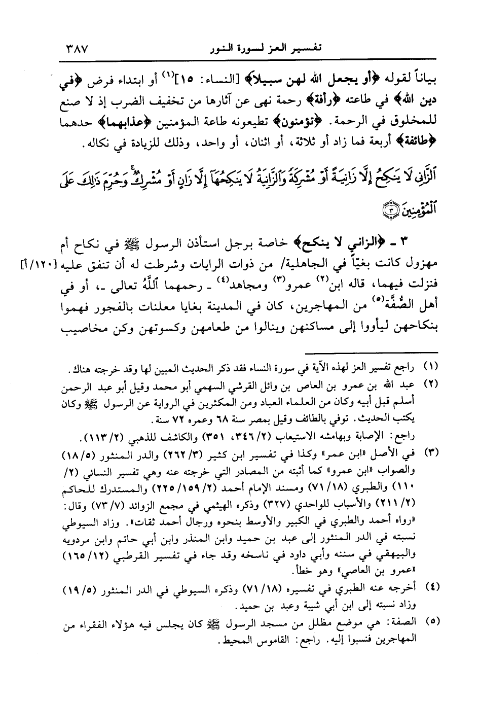 بياناً لقوله {أَوْ يَجْعَلَ الله لَهُنَّ سَبِيلاً} [النساء: 15] أو ابتداء فرض {فِى دِينِ اللَّهِ} في طاعته {رَأْفَةٌ} رحمة نهى عن آثارها من تخفيف الضرب إذ لا صنع للمخلوق في الرحمة. {تُؤْمِنُونَ} تطيعونه طاعة المؤمنين {عَذَابَهُمَا} حدهما {طَآئِفَةٌ} أربعة فما زاد أو ثلاثة، أو اثنان، أو واحد، وذلك للزيادة في نكاله. {الزاني لا ينكح إلا زانية أو مشركة والزانية لا ينكحها إلا زان أو مشرك وحرم ذلك على المؤمنين} \ 3 - {الزَّانِى لا يَنكِحُ} خاصة برجل استأذن الرسول [صلى الله عليه وسلم] في نكاح أم مهزول كانت بغيّاً في الجاهلية / [120 / أ] من ذوات الرايات وشرطت له أن تنفق عليه فنزلت فيهما، قال ابن عمرو ومجاهد - رحمهما اللَّهُ تعالى -، أو في أهل الصُّفَّة من المهاجرين، كان في المدينة بغايا معلنات بالفجور فهموا بنكاحهن ليأووا إلى مساكنهن وينالوا من طعامهن وكسوتهن وكن مخاصيب
