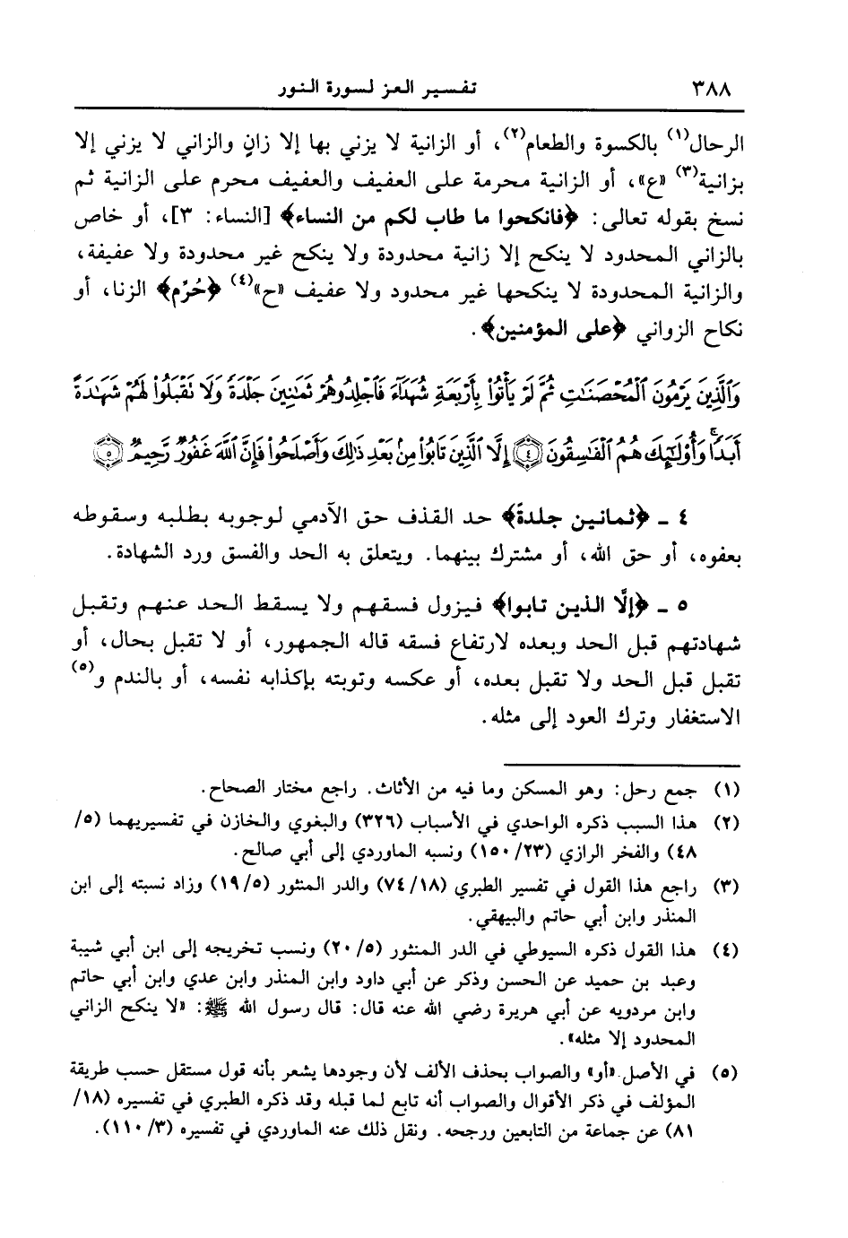 5 - {إِلاَّ الَّذِينَ تَابُواْ} فيزول فسقهم ولا يسقط الحد عنهم وتقبل شهادتهم قبل الحد وبعده لارتفاع فسقه قاله الجمهور، أو لا تقبل بحال، أو تقبل قبل الحد ولا تقبل بعده، أو عكسه وتوبته بإكذابه نفسه، أو بالندم والاستغفار وترك العود إلى مثله.