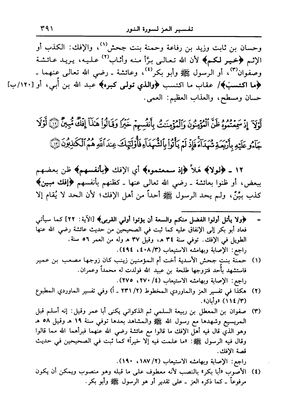 وحسان بن ثابت وزيد بن رفاعة وحمنة بنت جحش، والإفك: الكذب أو الإثم {خَيْرٌ لَّكُمْ} لأن الله تعالى برَّاْ منه وأثاب عليه، يريد عائشة وصفوان، أو الرسول [صلى الله عليه وسلم] وأبو بكر، وعائشة - رضي الله تعالى عنهما - {ما اكتسب} / [120 / ب] عقاب ما اكتسب {وَالَّذِى تَوَلَّى كِبْرَهُ} عبد الله بن أُبي، أو حسان ومسطح، والعذاب العظيم: العمى. {لولا إذ سمعتموه ظنّ المؤمنون والمؤمنات بأنفسهم خيراً وقالوا هذا إفكّ مبينٌ لولا جاءوا عليه بأربعة شهداء فإذ لم يأتوا بالشهداء فأولئك عند الله هم الكاذبون}