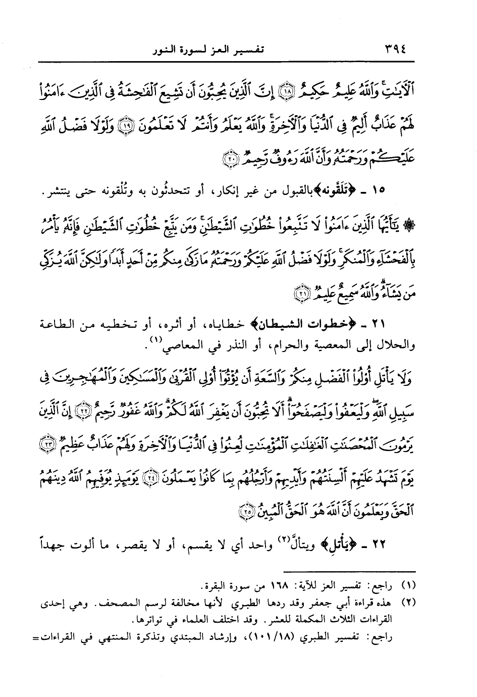 15 - {تَلَقَّوْنَهُ} بالقبول من غير إنكار، أو تتحدثُون به وتلقونه حتى ينتشر. {يا أيها الذين ءامنوا لا تتّبعوا خطوات الشيطان ومن يتّبعٍ خطوات الشيطان فإنّه يأمر بالفحشاء والمنكر ولولا فضل الله عليكم ورحمته ما زكى منكم من أحدٍ أبداً ولكن الله يزكى من يشاء والله سميع عليمٌ}