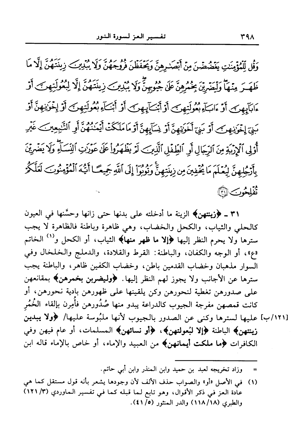 31 - {زِينَتَهُنَّ} الزينة ما أدخلته على بدنها حتى زانها وحسنها في العيون كالحلي والثياب، والكحل والخضاب، وهي ظاهرة وباطنة فالظاهرة لا يجب سترها ولا يحرم النظر إليها {إِلا مَا ظَهَرَ مِنْهَا} الثياب، أو الكحل والخاتم " ع "، أو الوجه والكفان، والباطنة: القرط والقلادة، والدملج والخلخال وفي السوار مذهبان وخضاب القدمين باطن، وخضاب الكفين ظاهر، والباطنة يجب سترها عن الأجانب ولا يجوز لهم النظر إليها. {وليضربن بخمرهن} بمقانعهن على صدورهن تغطية لنحورهن وكن يلقينها على ظهورهن بادية نحورهن، أو كانت قمصهن مفرجة الجيوب كالدراعة يبدو منها صُدُورهن فأُمِرن بإلقاء الخُمُرُ عليها لسترها وكنى عن الصدور بالجيوب لأنها ملبُوسة عليها / [121 / ب] {ولايبدين زِينَتَهُنَّ} الباطنة {إِلا لِبُعُولَتِهِنَّ} ، {أَوْ نِسَآئِهنَّ} المسلمات، أو عام فيهن وفي الكافرات {مَا مَلَكَتْ أَيْمَانُهُنَّ} من العبيد والإماء، أو خاص بالإماء قاله ابن