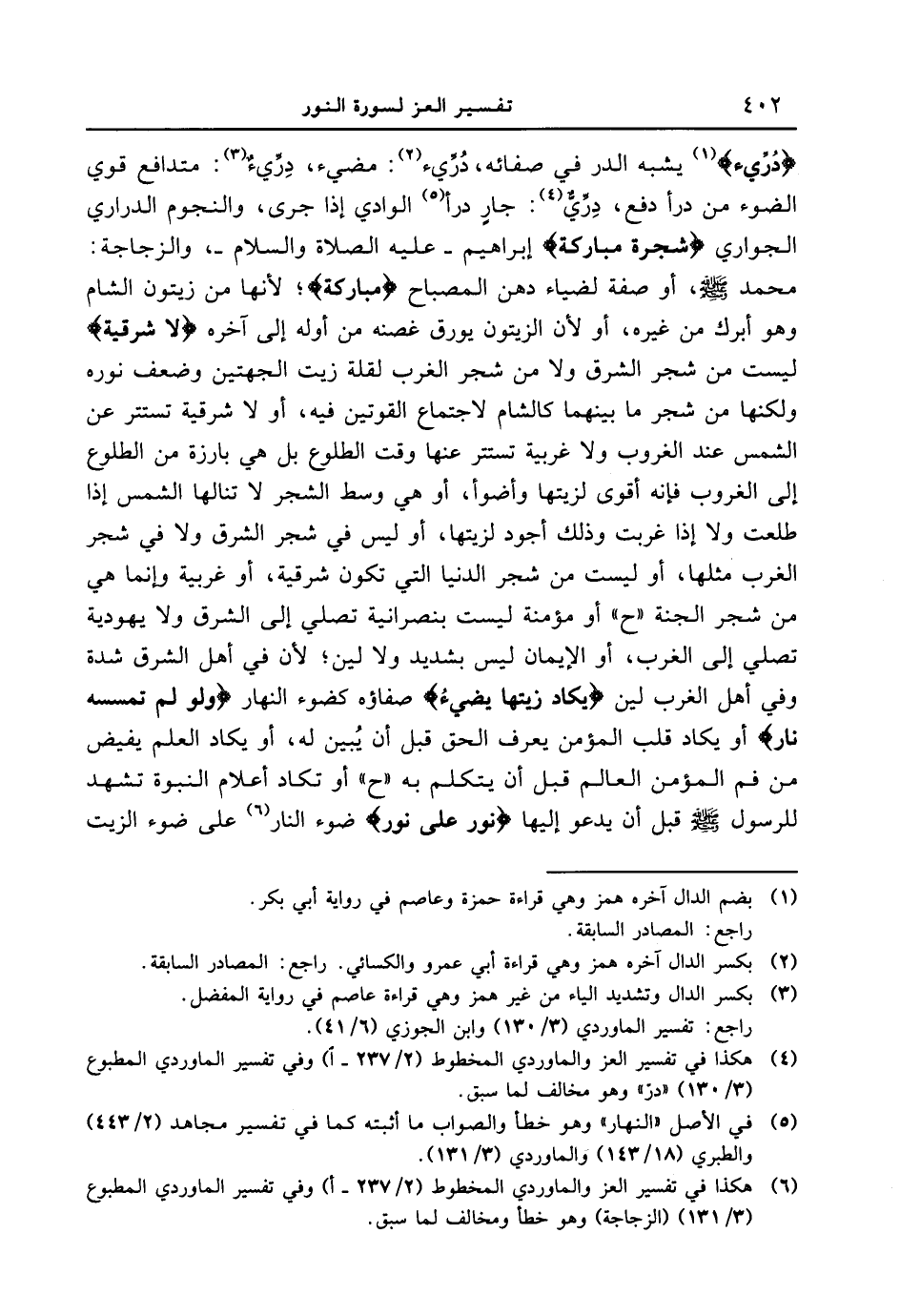 {درئ} يشبه الدر في صفائه، درئ: مضئ، درئ: متدافع قوي الضوء من درأ دفع دِرِّيٌّ: جارٍ درأ الوادي إذا جرى، والنجوم الدراري الجواري {شجرة مباركة} إبراهيم - عليه الصلاة والسلام -، والزجاجة: محمد [صلى الله عليه وسلم] ، أو صفة لضياء دهن المصباح {مُّبارَكَةٍ} ؛ لأنها من زيتون الشام وهو أبرك من غيره، أو لأن الزيتون يورق غصنه من أوله إلى آخره {لا شَرْقِيَّةٍ} ليست من شجر الشرق ولا من شجر الغرب لقلة زيت الجهتين وضعف نوره ولكنها من شجر ما بينهما كالشام لاجتماع القوتين فيه، أو لا شرقية تستتر عن الشمس عند الغروب ولا غربية تستتر عنها وقت الطلوع بل هي بارزة من الطلوع إلى الغروب فإنه أقوى لزيتها وأضوأ، أوهي وسط الشجر لا تنالها الشمس إذا طلعت ولا إذا غربت وذلك أجود لزيتها، أو ليس في شجر الشرق ولا في شجر الغرب مثلها، أوليست من شجر الدنيا التي تكون شرقية، أو غربية وإنما هي من شجر الجنة " ح " أو مؤمنة ليست بنصرانية تصلي إلى الشرق ولا يهودية تصلي إلى الغرب، أو الإيمان ليست بشديد ولا لين؛ لأن في أهل الشرق شدة وفي أهل الغرب لين {يَكَادُ زَيْتُهَا يُضِىءُ} صفاؤه كضوء النهار {وَلَوْ لَمْ تَمْسَسْهُ نَارٌ} أو يكاد قلب المؤمن من يعرف الحق قبل أن يُبين له، أو يكاد العلم يفيض من فم المؤمن العالم قبل أن يتكلم به " ح " أو تكاد أعلام النبوة تشهد للرسول [صلى الله عليه وسلم] قبل أن يدعو إليها {نُّورٌ عَلَى نُورِ} ضوء النار على ضوء الزيت