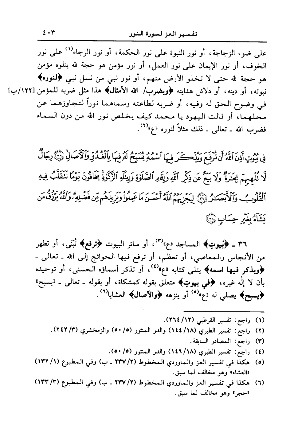36 - {بُيُوتٍ} المساجد " ع "، أو سائر البيوت {تُرْفَعَ} تُبْنَى، أو تطهر من الأنجاس والمعاصي، أو تعظم، أو ترفع فيها الحوائج إلى الله - تعالى - {وَيُذْكَرَ فِيهَا أسْمُهُ} يتلى كتابه " ع "، أو تذكر أسماؤه الحسنى، أو توحيده بأن لا إله غيره، {فِى بُيُوتٍ} متعلق بقوله كمشكاة، أو بقوله - تعالى - " يسبح " {يُسَبِّحُ} يصلي له " ع " أو ينزهه {وَالأَصَالِ} العشايا.