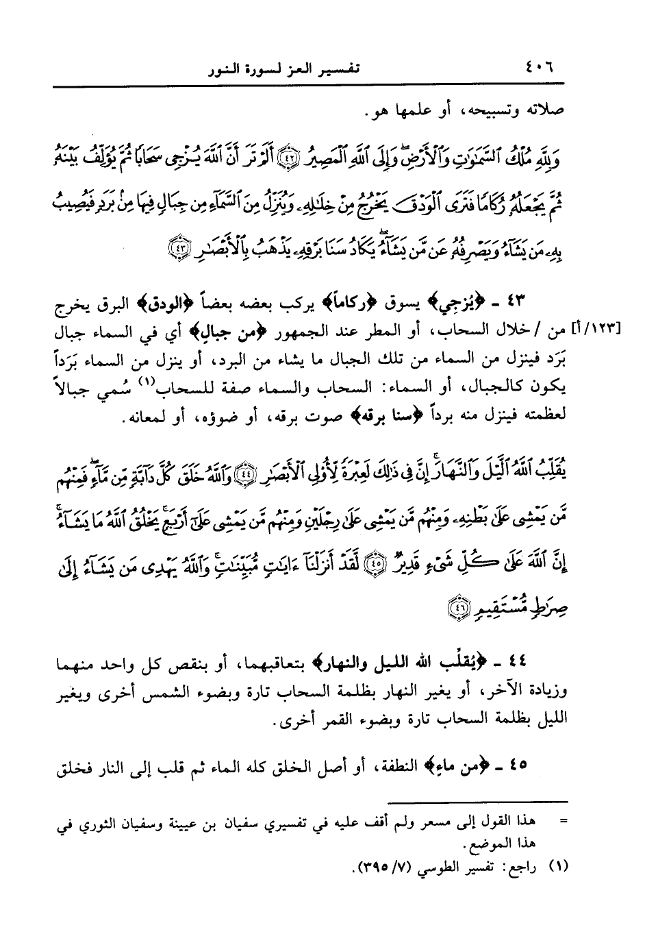 43 - {يُزْجِى} يسوق {رُكَاماً} يركب بعضه بعضاً {الْوَدْقَ} البرق يخرج من / [123 / أ] خلال السحاب، أو المطر عند الجمهور {مِن الجبال} أي في السماء جبال بَرَد فينزل من السماء من تلك الجبال ما يشاء من البرد، أو ينزل من السماء بَرَداً يكون كالجبال، أو السماء: السحاب والسماء صفة للسحاب سُمي جبالاً لعظمته فينزل منه برداً {سَنَا بَرْقِهِ} صوت برقه، أو ضوؤه، أو لمعانه. {يقلب الله الّيل والنّهار إنّ فى ذلك لعبرة لأولى الأبصار والله خلق كلّ دابّة من مآء فمنهم من يمشى على بطنه ومنهم من يمشى على رجلين ومنهم من يمشى على أربع يخلق الله ما يشاء إنّ الله على كل شىء قديرٌ لّقد أنزلنا ءايات مبيّنات والله يهدى من يشاء إلى صراط مستقيم}