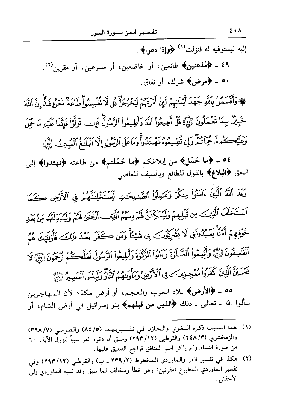 50 - {مرض} شرك، أو نفاق. {وأقسموا بالله جهد أيمانهم لئن أمرتهم ليخرجن قل لا تقسموا طاعة معروفة إن الله خبير بما تعملون قل أطيعوا الله وأطيعوا الرسول فإن تولوا فإنما عليه ما حمل وعليكم ما حملتم وإن تطيعوه تهتدوا وما على الرسول إلا البلاغ المبين}