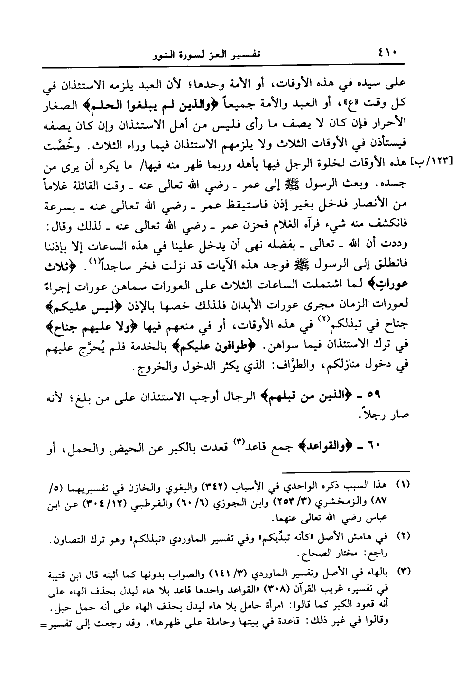 على سيده في هذه الأوقات، أو الأمة وحدها؛ لأن العبد يلزمه الاستئذان في كل وقت " ع "، أو العبد والأمة جميعاً {وَالَّذِينَ لَمْ يَبْلُغُواْ الْحُلُمَ} الصغار الأحرار فإن كان لا يصف ما رأى فليس من أهل الاستئذان وإن كان يصفه فيستأذن في الأوقات الثلاث ولا يلزمهم الاستئذان فيما وراء الثلاث. وخُصَّت هذه الأوقات لخلوة الرجل فيها بأهله وربما ظهر منه فيها / [123 / ب] ما يكره أن يرى من جسده. وبعث الرسول [صلى الله عليه وسلم] إلى عمر - رضي الله تعالى عنه - وقت القائلة غلاماً من الأنصار فدخل بغير إذن فاستيقظ عمر - رضي الله تعالى عنه - بسرعة فانكشف منه شيء فرآه الغلام فحزن عمر - رضي الله تعالى عنه - لذلك وقال: وددت أن الله - تعالى - بفضله نهى أن يدخل علينا في هذه الساعات إلا بإذننا فانطلق إلى الرسول [صلى الله عليه وسلم] فوجد هذه الآيات قد نزلت فخر ساجداً. {ثَلاثُ عَوْرَاتٍ} لما اشتملت الساعات الثلاث على العورات سماهن عورات إجراءً لعورات الزمان مجرى عورات الأبدان فلذلك خصها بالإذن {لَيْسَ عَلَيْكُمْ} جناح في تبذلكم في هذه الأوقات، أو من منعهم فيها {وَلا عَلَيْهِمْ جُنَاحٌ} في ترك الاستئذان فيما سواهن. {طَوَّافُونَ عَلَيْكُم} بالخدمة فلم يُحرَّج عليهم في دخول منازلكم، والطوَّاف: الذي يكثر الدخول والخروج.