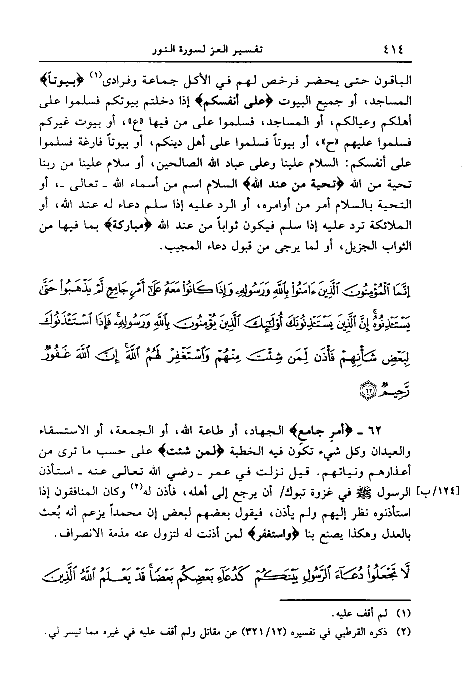 الباقون حتى يحضر فرخص لهم في الأكل جماعة وفرادى {بُيُوتاً} المساجد، أو جميع البيوت {عَلَى أَنفُسِكُمْ} إذا دخلتم بيوتكم فسلموا على أهلكم وعيالكم، أو المساجد، فسلموا على من فيها " ع "، أو بيوت غيركم فسلموا عليهم " ح "، أوبيوتاً فسلموا على أهل دينكم، أو بيوتاً فارغة فسلموا على أنفسكم: السلام علينا وعلى عباد الله الصالحين، أو سلام علينا من ربنا تحية من الله {تَحِيَّةً مِّنْ عِندِ اللَّهِ} السلام اسم من أسماء الله - تعالى -، أو الملائكة ترد عليه إذا سلم فيكون ثواباً من عند الله {مُبَارَكَةً} بما فيها من الثواب الجزيل، أو لما يرجى من قبول دعاء المجيب. {إنّما المؤمنون الذين ءامنوا بالله ورسوله وإذا كانوا معه على أمرٍ جامعٍ لم يذهبوا حتى يستئذنوه إن الذين يستئذنوك أولئك الذين يؤمنون بالله ورسوله فإذا استئذنوك لبعض شأنهم فإذن لمن شئت منهم واستغفر لهم الله إن الله غفورٌ رحيمٌ 8}