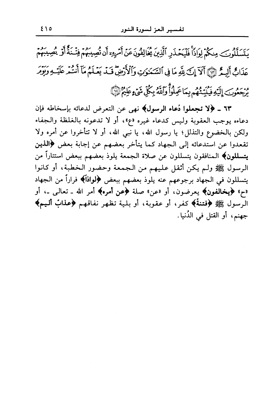 63 - {لا تَجْعَلُواْ دُعَآءَ الرَّسُولِ} نهى عن التعرض لدعائه بإسخاطه فإن دعاءه يوجب العقوبة وليس كدعاء غيره " ع "، أو لا تدعونه بالغلطة والجفاء ولكن بالخضوع والتذلل؛ يا رسول الله، يا نبي الله، أو لا تتأخروا عن أمره ولا تقعدوا عن استدعائه إلى الجهاد كما يتأخر بعضهم عن أجابة بعض {الَّذِينَ يَتَسَلَّلُونَ} المنافقون يتسللون عن صلاة الجمعة يلوذ بعضهم ببعض استتاراً من الرسول [صلى الله عليه وسلم] ولم يكن أثقل عليهم من الجمعة وحضور الخطبة، أو كانوا يتسللون في الجهاد برجوعهم عنه يلوذ بعضهم ببعض {لِوَاذاً} فراراً من الجهاد " ح " {يُخَالِفُونَ} يعرضون، أو " عن " صلة {عَنْ أَمْرِهِ} أمر الله - تعالى -، أو الرسول [صلى الله عليه وسلم] {فتنة} كفر، أوعقوبة، أو بلية تظهر نفاقهم {عَذَابٌ أَلِيمٌ} جهنم، أو القتل في الدنيا.