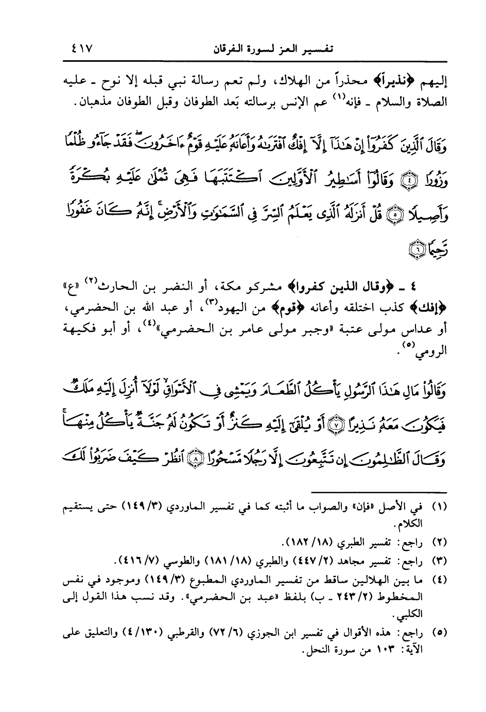 4 - {وقال الذين كفروا} مشركو مكة، أوالنضر بن الحارث " ع " {إِفْكٌ} كذب اختلقه وأعانه {قَوْمٌ} من اليهود، أو عبد الله بن الحضرمي، أو عداس مولى عتبة " وجبر مولى عامر بن الحضرمي "، أو أبو فكيهة الرومي. {وقالوا مال هذا الرسول يأكل الطعام ويمشي في الأسواق لولا أنزل إليه ملكٌ فيكون معه نذيراً أو يلقى إليه كنزٌ أو تكون له جنةٌ يأكل منها وقال الظالمون إن تتّبعون إلا رجلاً مسحوراً انظر كيف ضربوا لك