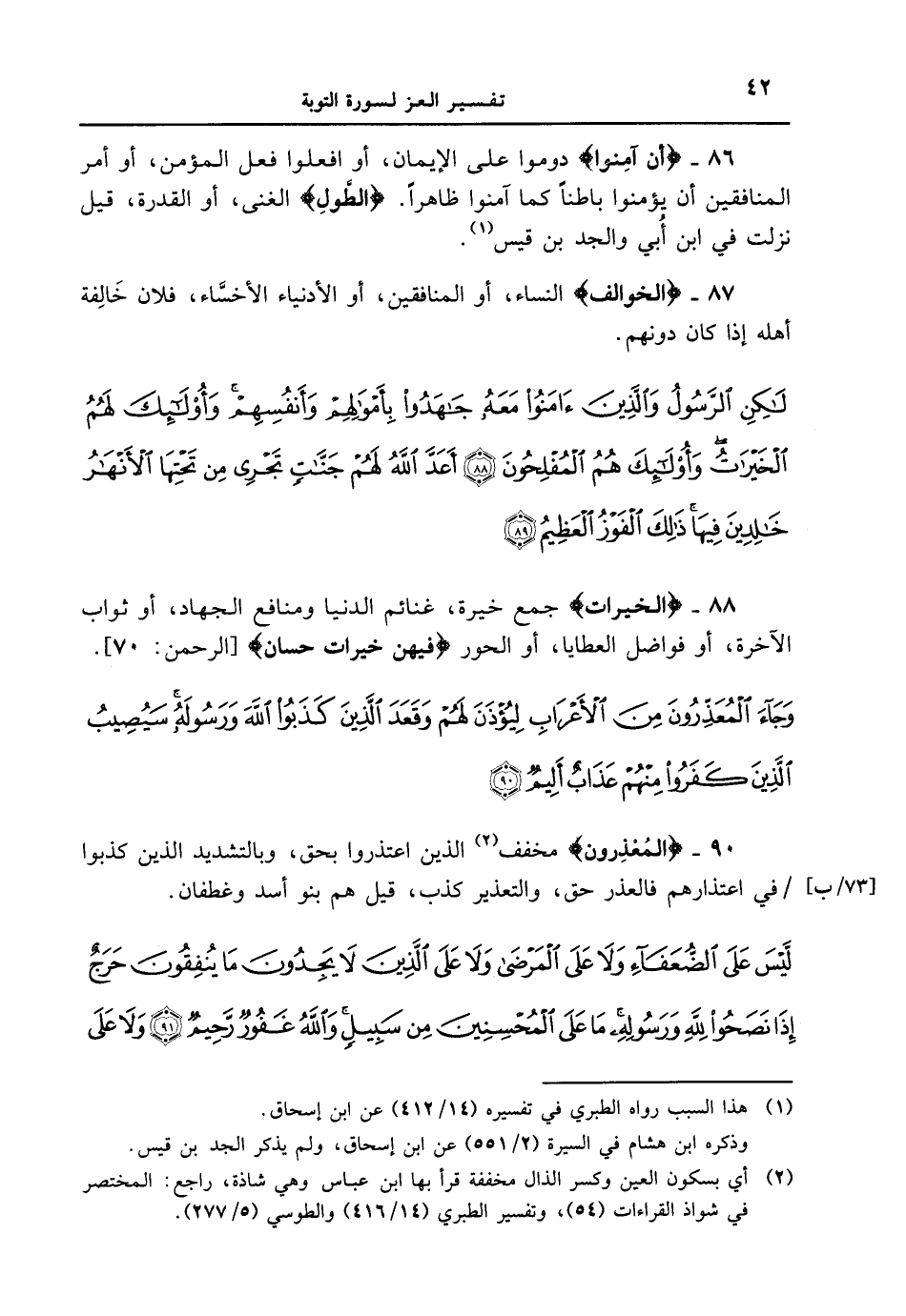 90 - {الْمُعَذِّرُونَ} مخفف الذين اعتذروا بحق، وبالتشديد الذين كذبوا [73 / ب] في اعتذارهم فالعذر حق، والتعذير كذب، قيل هم بنو أسد وغطفان. {ليس على الضعفاء ولا على المرضى ولا على الذين لا يجدون ماينفقون حرجٌ إذا نصحوا لله ورسوله ما على المحسنين من سبيلٍ والله غفور رحيم ولا على