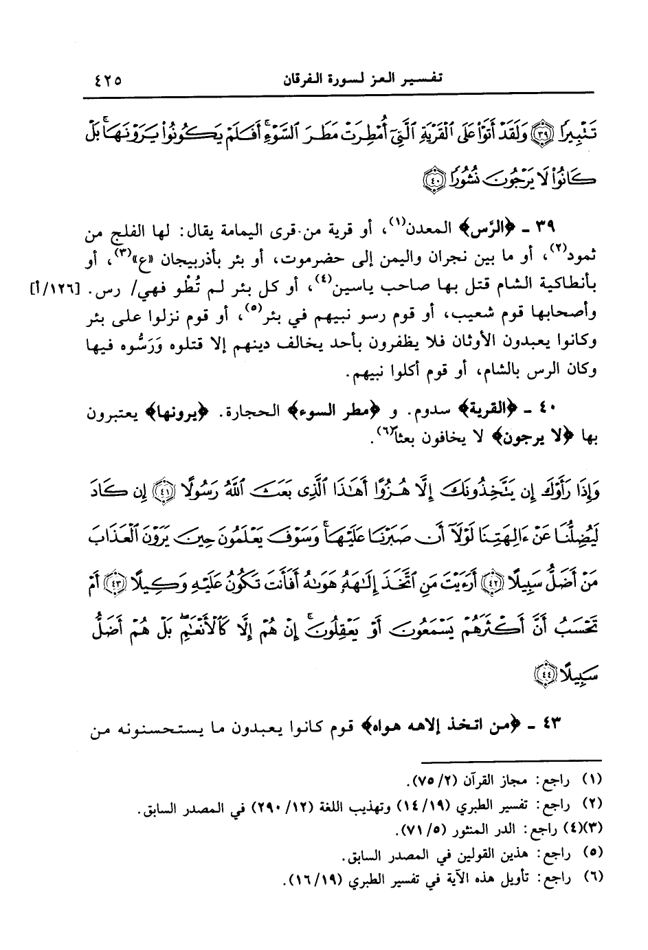 40 - {الْقَرْيَةِ} سدوم. و {مَطَرَ السَّوْءِ) {الحجارة} (يَرَوْنَهَا} يعتبرون بها {لا يَرْجُونَ} لا يخافون بعثاً. {وإذا رأوك إن يتخذونك إلا هزواً أهذا الذي بعث الله رسولاً إن كاد ليضلنا عن ءالهتنا لولا أن صبرنا عليها وسوف يعلمون حين يرون العذاب من أضلُّ سبيلاً أرءيت من اتَخذ إلاههُ هواهُ أفأنت تكون عليه وكيلاً أم تحسبُ أن أكثرهم يسمعون أو يعقلون إن هم إلاَّ كالأنعام بل هم أضلُّ سبيلاً
