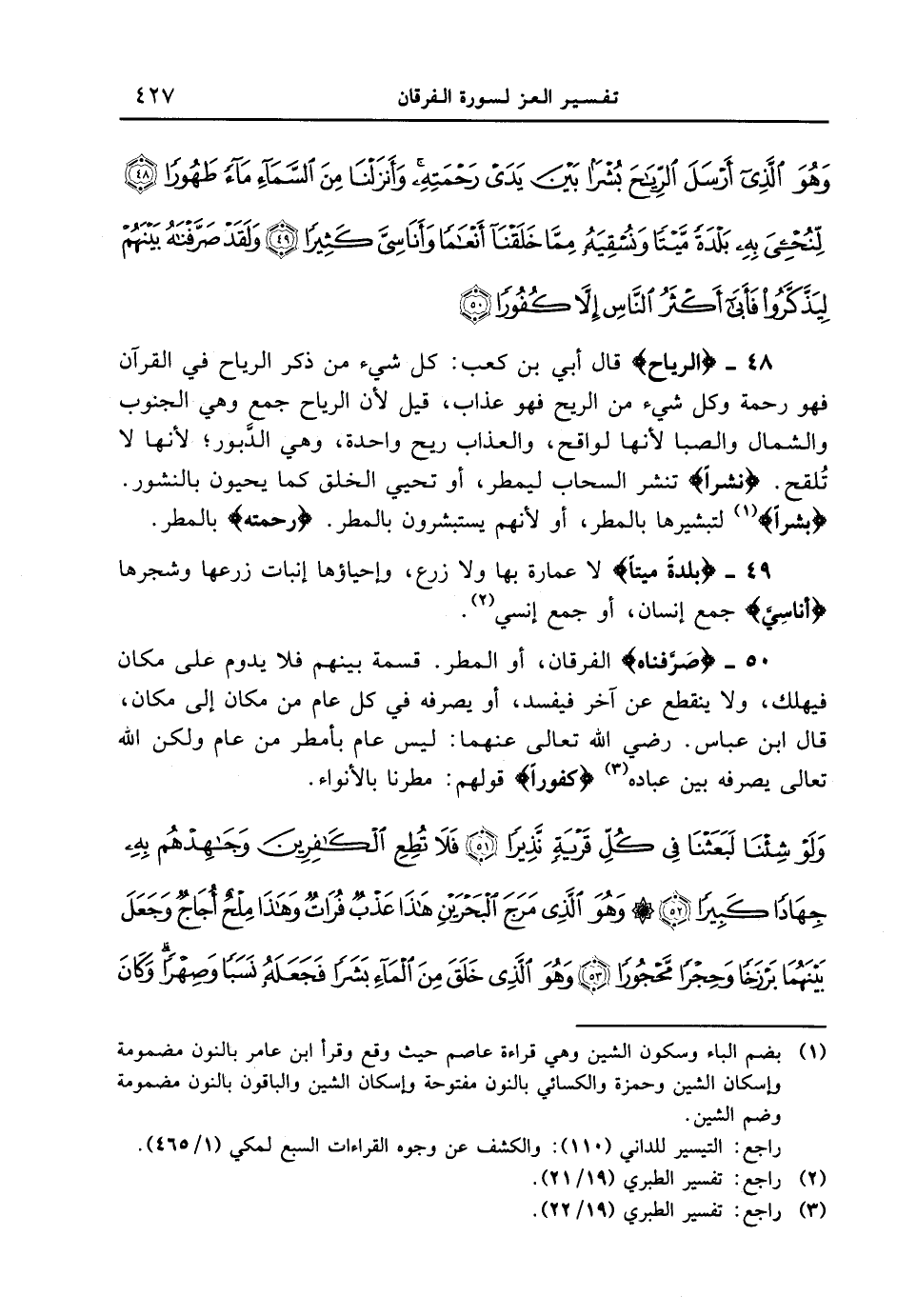 48 - {الرِّيَاحَ} قال أُبي بن كعب: كل شيء من ذكر الرياح في القرآن فهو رحمة وكل شيء من الريح فهو عذاب، قيل لأن الرياح جمع وهي الجنوب والشمال والصبا لأنها لواقح، والعذاب ريح واحدة، وهي الدَّبور؛ لأنها لا تُلقح. {نشراً} تنشر السحاب ليمطر، أو تحيي الخلق كما يحيون بالنشور. {بشراً} لتبشيرها بالمطر. أو لأنهم يستبشرون بالمطر. {رَحْمَتِهِ} بالمطر.