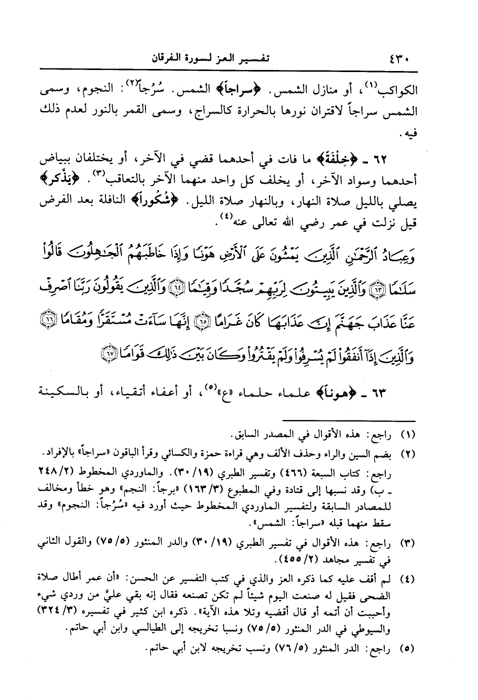 62 - {خِلْفَةً} ما فات في أحدهما قضي في الآخر، أو يختلفان ببياض أحدهما وسواد الآخر، أو يخلف كل واحد منهما الآخر بالتعاقب. {يَذَّكَّرَ} يصلي بالليل صلاة النهار، وبالنهار صلاة الليل. {شُكُوراً} النافلة بعد الفرض قيل نزلت في عمر رضي الله تعالى عنه. {وعباد الرحمن الذين يمشون على الأرض هونا وإذا خاطبهم الجاهلون قالوا سلاما والذين يبيتون لربهم سجدا وقياما والذين يقولون ربنا اصرف عنا عذاب جهنم إن عذابها كان غراما إنها ساءت مستقرا ومقاما والذين إذا أنفقوا لم يسرفوا ولم يقتروا وكان بين ذلك قواما}