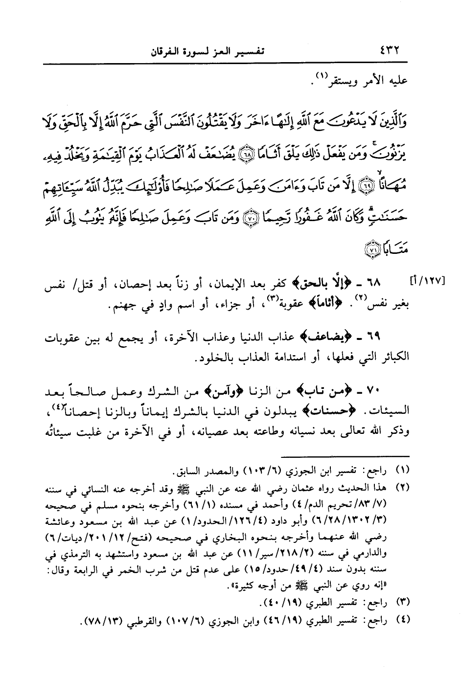 عليه الأمر ويستقر. {والذين لا يدعون مع الله إلهاً ءاخر ولا يقتلون النفس التي حرم الله إلا بالحق ولا يزنون ومن يفعل ذلك يلق اثاماً يضاعف له العذاب يوم القيامة ويخلد فيه مهاناً إلا من تاب وءامن وعمل عملاً صالحاً فأولئك يبدّل الله سيئاتهم حسناتٍ وكان الله غفوراً رحيماً ومن تاب وعمل صالحاً فإنّه يتوب إلى الله متاباً 71}