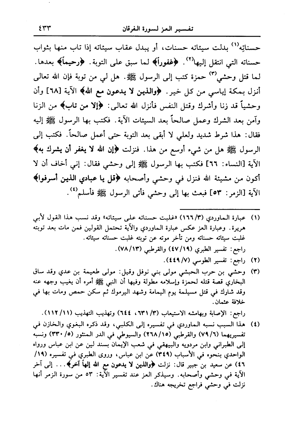 حسناتِه بُدلت سيئاته حسنات، أو يبدل عقاب سيئاته إذا تاب منها بثواب حسناته التي انتقل إليها. {غَفُوراً} لما سبق على التوبة. {رَّحِيماً} بعدها. لما قتل وحشي حمزة كتب إلى الرسول [صلى الله عليه وسلم] هل لي من توبة فإن الله تعالى أنزل بمكة إياسي من كل خير. {والذين لا يدعون مع الله} الآية [68] وأن وحشياً قد زنا وأشرك وقتل النفس فأنزل الله تعالى: {إلا مَن تَابَ} من الزنا وآمن بعد شرك وعمل صالحاً بعد السيئات الآية. فكتب بها الرسول [صلى الله عليه وسلم] إليه فقال: هذا شرط شديد ولعلي لا أبقى بعد التوبة حتى أعمل صالحاً. فكتب إلى الرسول [صلى الله عليه وسلم] هل من شيء أوسع من هذا. فنزلت {إِنَّ الله لاَ يَغْفِرُ أَن يُشْرَكَ بِهِ} الآية [النساء: 66] فكتب بها الرسول [صلى الله عليه وسلم] إلى وحشي فقال: إني أخاف أن لا أكون من مشيئة الله فنزل في وحشي وأصحابه {قل يا عبادي الذين أَسْرَفُواْ} الآية [الزمر: 53] فبعث بها إلى وحشي فأتى الرسول [صلى الله عليه وسلم] فأسلم.