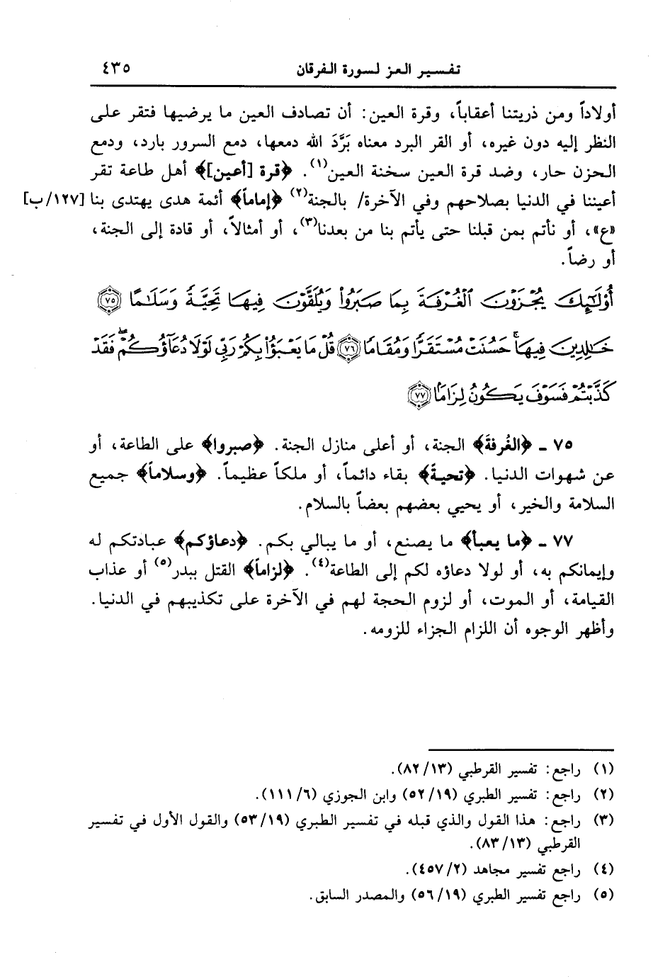75 - {الْغُرْفَةَ} الجنةٍ، أو أعلى منازل الجنة {صَبَرُواْ} على الطاعة، أو عن شهوات الدنيا. {تَحِيَّةً} بقاء دائماً، أو ملكاً عظيماً، {وَسَلاماً} جميع السلامة والخير، أو يحيي بعضهم بعضاً بالسلام.