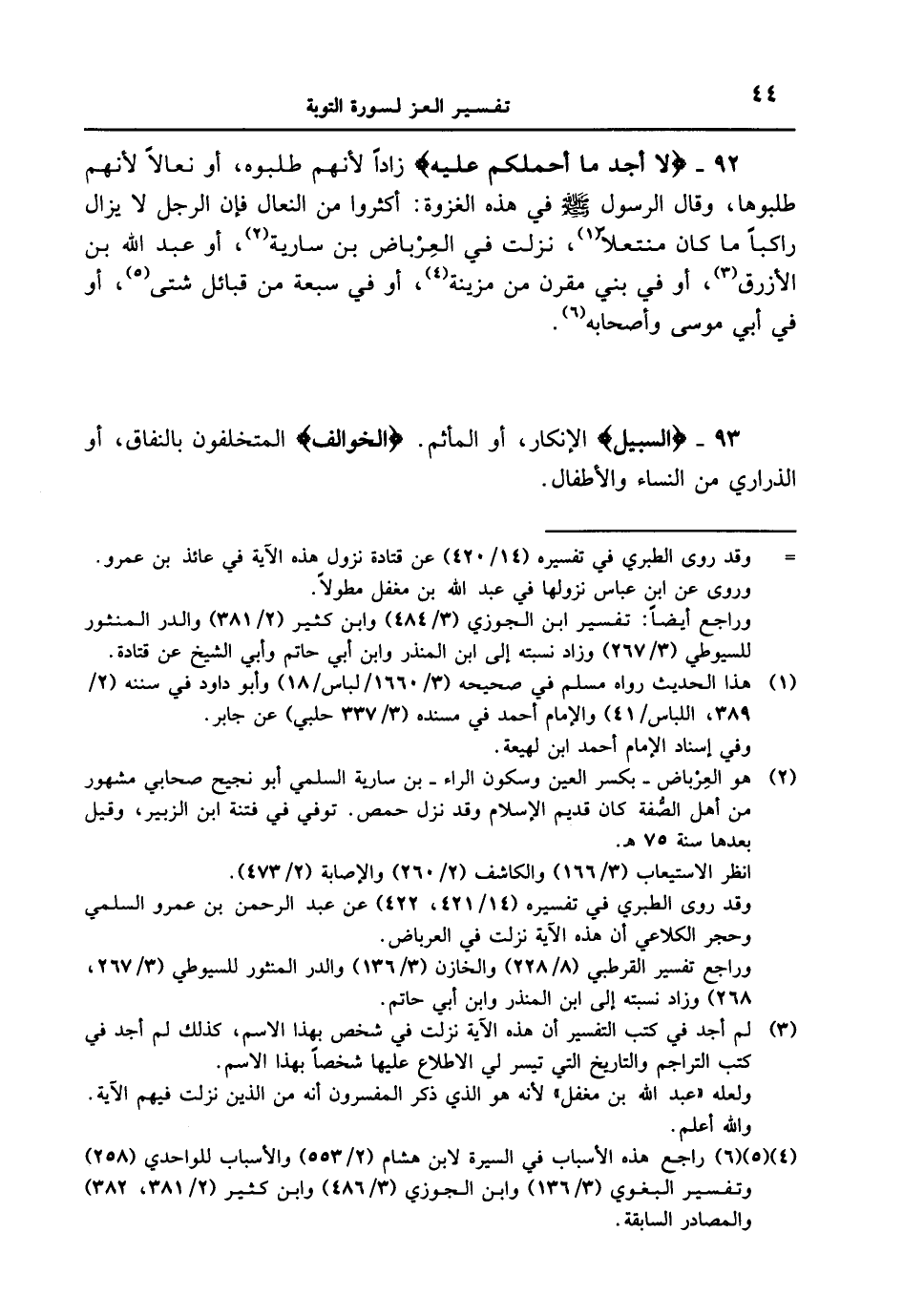 92 - {لا أجد ماأحملكم عَلَيْهِ} زاداً لأنهم طلبوه، أو نعالاً لأنهم طلبوها، وقال الرسول [صلى الله عليه وسلم] في هذه الغزوة: أكثروا من النعال فإن الرجل لا يزال راكباً ما كان منتعلاً، نزلت في العِرْباض بن سارية، أو عبد الله بن الأزرق، أو في بني مقرن من مزينة، أو في سبعة من قبائل شتى، أو في أبي موسى وأصحابه.