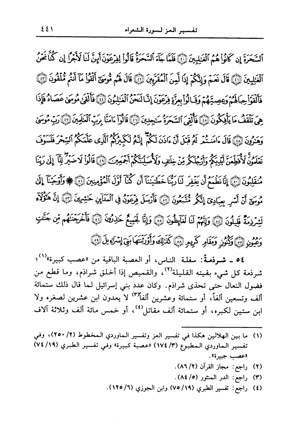 54 - {شرذمة: سفلة الناس، أو العصبة الباقية من " عصب كبيرة "؛ شرذمة كل شيء بقيته القليلة، والقميص إذا أخلق شراذم، وما قطع من فضول النعال حتى تحذي شراذم. وكان عدد بني إسرائيل لما قال ذلك ستمائة ألف وتسعين ألفاً، أو ستمائة وعشرين ألفاً لا يعدون ابن عشرين لصغره ولا ابن ستين لكبره، أو ستمائة ألف مقاتل، أو خمس مائة ألف وثلاثة آلاف