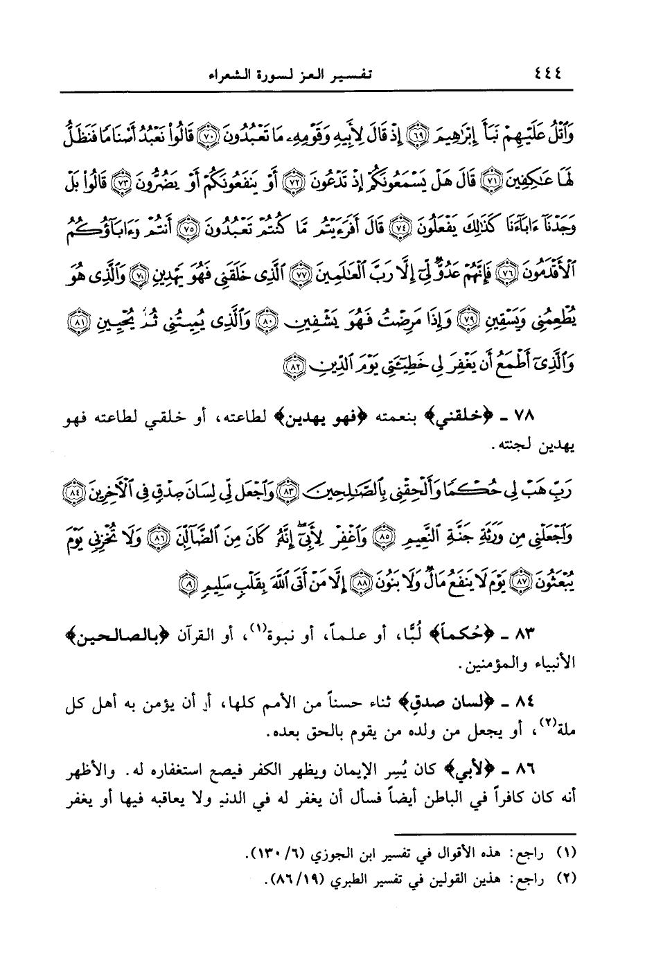 78 - {خَلَقَنِى) {بنعمته} (فَهْوَ يَهْدِينِ} لطاعته، أو خلقني لطاعته فهو يهدين لجنته. {ربّ هب لي حكماً وألحقني بالصالحات واجعل لي لسان صدقٍ في الآخرين واجعلني من ورثة جنة النعيم واغفر لأبي إنّه كان من الضالين ولا تخزني يوم يبعثون يوم لا ينفع مالٌ ولا بنون إلا من أتى الله بقلب سليمٍ}