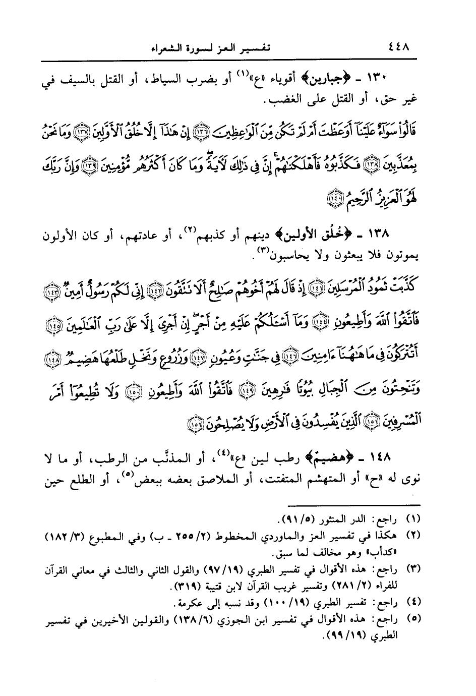 138 - {خُلُقُ الأَوَّلِينَ} دينهم أو كذبهم، أو عادتهم، أو كان الأولون يموتون فلا يبعثون ولا يحاسبون. {كذّبت ثمود المرسلين إذ قال لهم أخوهم صالحٌ الأ تتقون إني لكم رسولٌ أمين فاتقوا الله وأطيعون وما أسئلكم عليه من أجرٍ إن أجرى إلا على رب العالمين أتتركون في ما هاهنا ءامنين في جنات وعيونٍ وزروع ونخلٍ طلعها هضيمٌ وتنحتون من الجبال بيوتاً فارهين 149 فاتقوا الله وأطيعون ولا تطيعوا أمر المسرفين الذين يفسدون في الأرض ولا يصلحون 152}