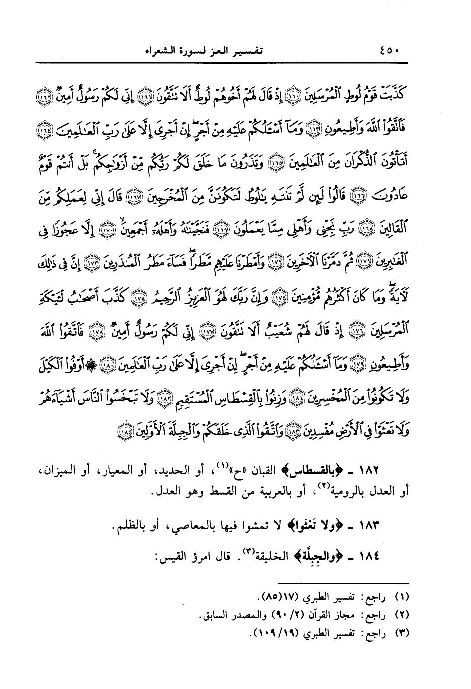182 - {بِالْقِسْطَاسِ} القبان " ح "، أو الحديد، أو المعيار، أو الميزان، أو العدل بالرومية، أو بالعربية من القسط وهو العدل.