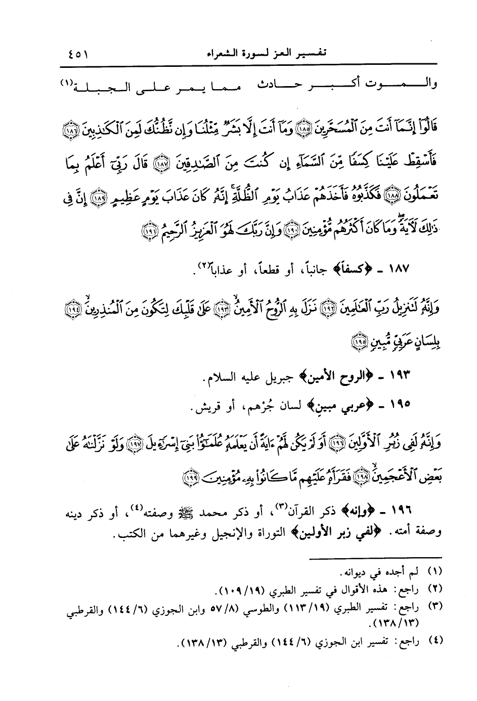 187 - {كسفا} جانباً، أو قطعاً، أوعذاباً. {وإنه لتنزيل رب العالمين نزل به الروح الأمين على قلبك لتكون من المنذرين بلسان عربي مبين}