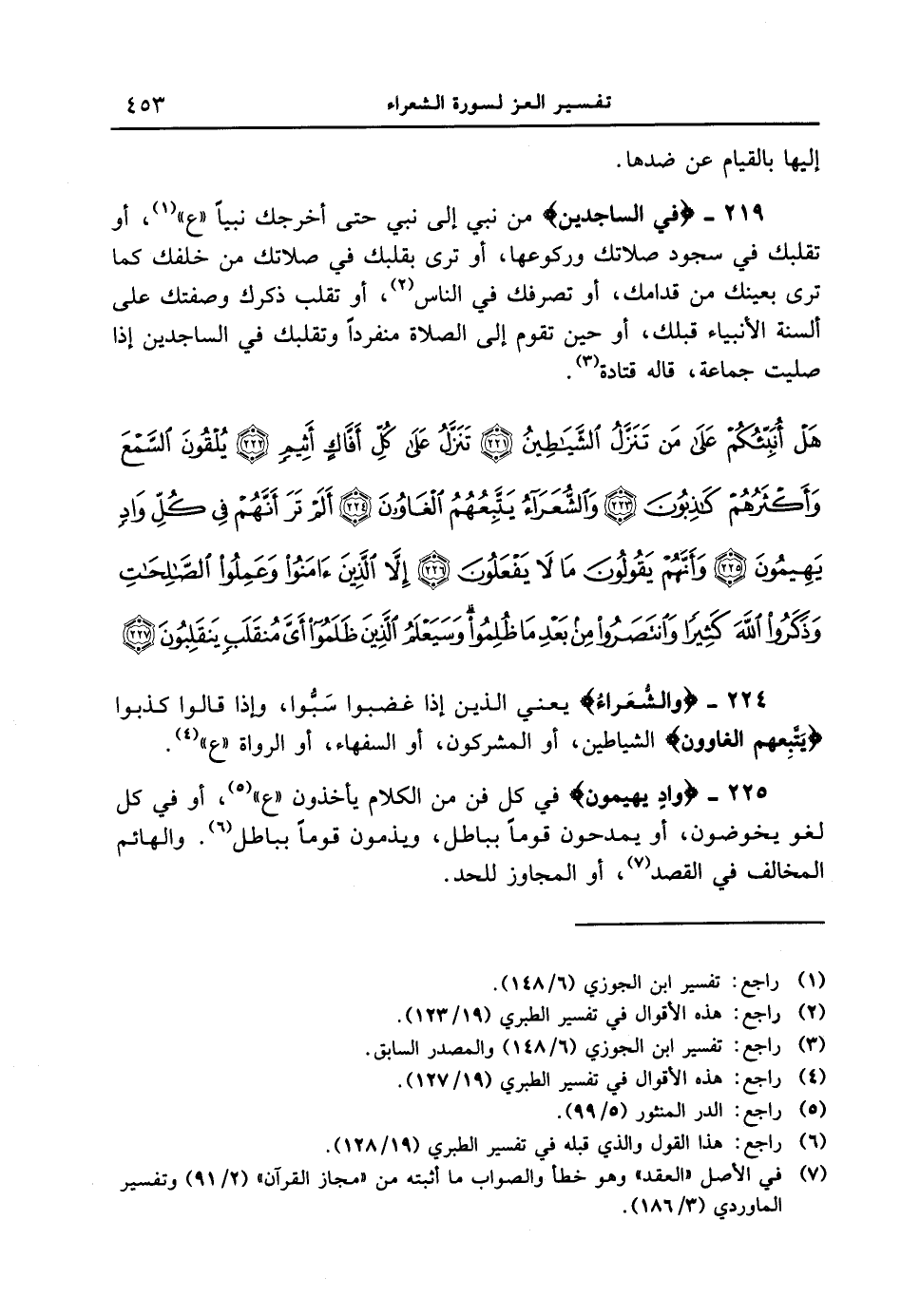 219 - {فِى السَّاجِدِينَ} من نبي إلى نبي حتى أخرجك نبياً " ع "، أو تقلبك في سجود صلاتك وركوعها، أو ترى بقلبك في صلاتك من خلفك كما ترى بعينك من قدامك، أو تصرفك في الناس، أو تقلب ذكرك وصفتك على ألسنة الأنبياء قبلك، أو حين تقوم إلى الصلاة منفرداً وتقلبك في الساجدين إذا صليت جماعة، قاله قتادة. {هل أنبئكم على من تنزل الشياطين تنزّل على كل أفاكٍ أثيم يلقون السمع وأكثرهم كاذبون 223 والشعراء يتبعهم الغاون ألم تر أنّهم في كل وادٍ يهيمون وأنّهم يقولون ما لا يفعلون إلا الذين ءامنوا وعملوا الصالحات وذكروا الله كثيراً وانتصروا من بعد ما ظلموا وسيعلم الذين ظلموا أي منقلبٍ ينقلبون}