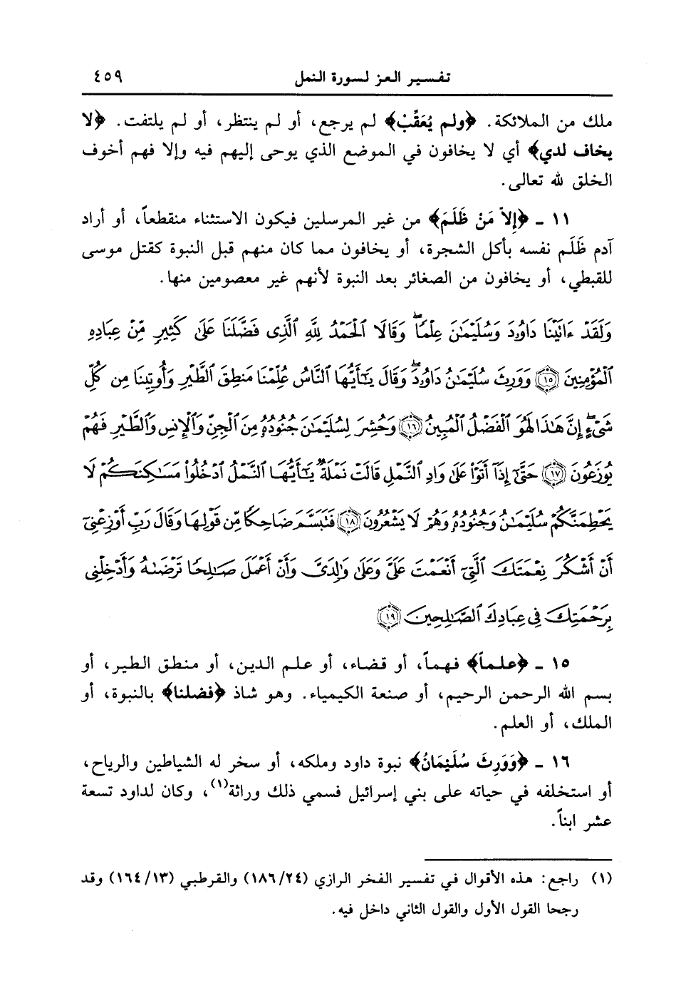 11 - {إلا من ظلم} من غيرالمرسلين فيكون الاستثناء منقطعاً، أو أراد آدم ظَلَم نفسه بأكل الشجرة، أو يخافون مما كان منهم قبل النبوة كقتل موسى للقبطي، أو يخافون من الصغائر بعد النبوة لأنهم غير معصومين منها. {ولقد ءاتينا داود وسليمان علماً وقالا الحمد لله الذي فضلنا على كثيرٍ من عباده المؤمنين وورث سليمان داود وقال يا أيها الناس علمنا منطق الطير وأوتينا من كل شيء إن هذا لهو الفضل المبين وحشر لسليمان جنوده من الجن والإنس والطير فهم يوزعون حتى إذا أتوا على وادٍ النمل قالت نملةٌ يا أيها النمل ادخلوا مساكنكم لا يحطمنّكم سليمان وجنوده وهم لا يشعرون فتبسم ضاحكاً من قولها وقال رب أوزعني أن اشكر نعمتك التي أنعمت على وعلى والدي وأن أعمل صالحاً ترضاه وأدخلني برحمتك في عبادك الصالحين}