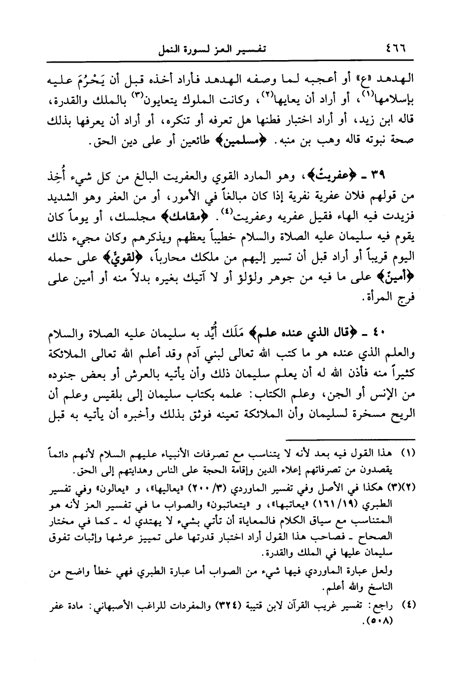 39 - {عِفْرِيتٌ} ، وهو المارد القوي والعفريت البالغ من كل شيء أُخِذ من قولهم فلان عفرية نفرية إذا كان مبالغاً في الأمور. أو من العفر وهو الشديد فزيدت فيه الهاء فقيل عفريه وعفريت. {مَّقَامِكَ} مجلسك، أو يوماً كان يقوم فيه سليمان عليه الصلاة والسلام خطيباً يعظهم ويذكرهم وكان مجيء ذلك اليوم قريباً أو أراد قبل أن تسير إليهم من ملكك محارباً، {لَقَوِىٌ} على حمله {أَمِينٌ} على ما فيه من جوهر ولؤلؤ أو لا آتيك بغيره بدلاً منه أو أمين على فرج المرأة.