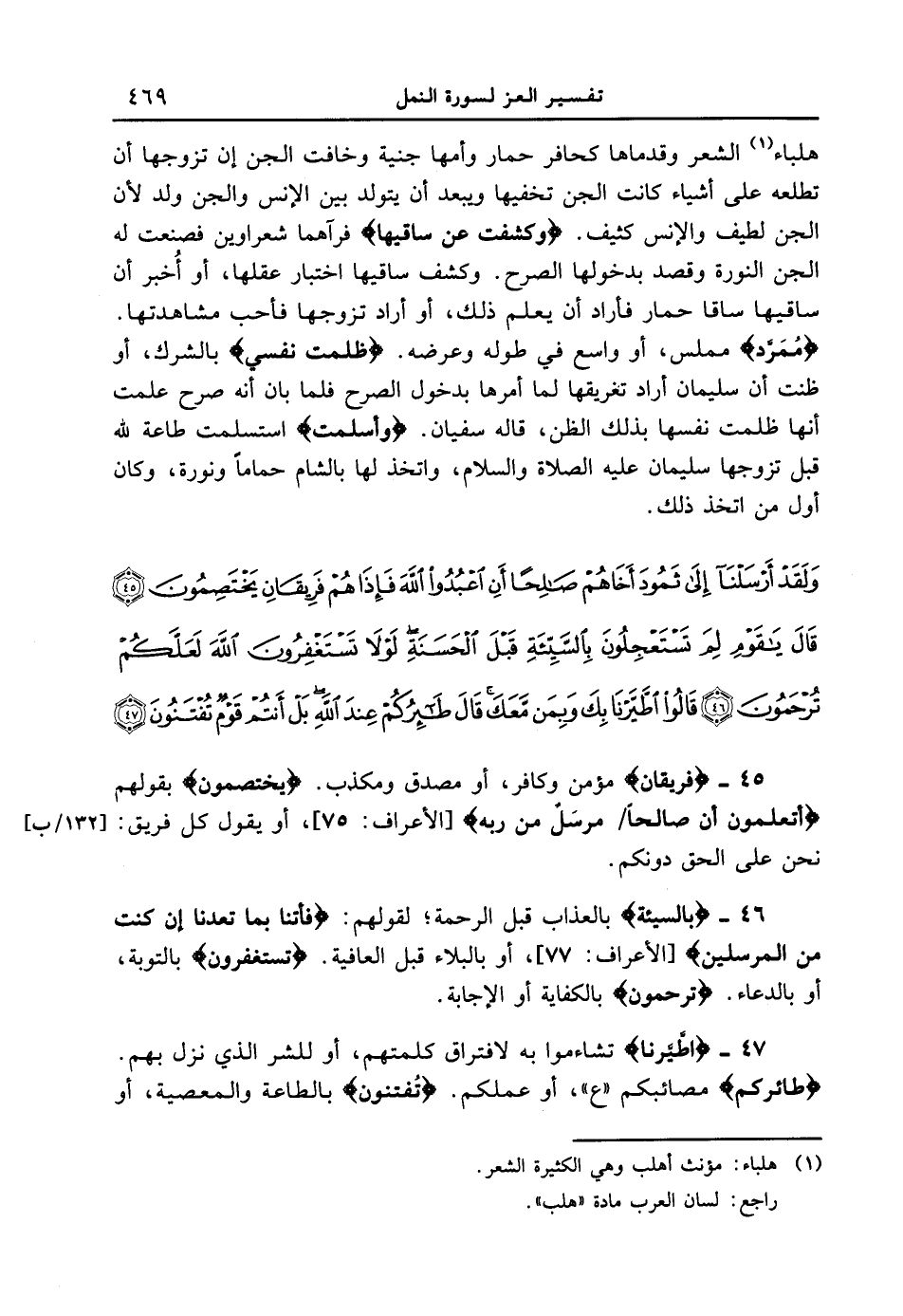 هلباء الشعر وقدماها كحافر حمار وأمها جنية وخافت الجن إن تزوجها أن تطلعه على أشياء كانت الجن تخفيها ويبعد أن يتولد بين الإنس والجن ولد لأن الجن لطيف والإنس كثيف. {وَكَشَفَتْ عَن سَاقَيْهَا} فرأهما شعراوين فصنعت له الجن النورة وقصد بدخولها الصرح. وكشف ساقيها اختبار عقلها، أو أُخبر أن ساقيها ساقاً حمار فأراد أن يعلم ذلك، أو أراد تزوجها فأحب مشاهدتها. {مُّمَرَّدٌ} مملس، أو واسع في طوله وعرضه. {ظَلَمْتُ نَفْسِى} بالشرك، أو ظنت أن سليمان أراد تغريقها لما أمرها بدخول الصرح فلما بان أنه صرح علمت أنها ظلمت نفسها بذلك الظن، قاله سفيان. {وَأَسْلَمْتُ} استسلمت طاعة لله قبل تزوجها سليمان عليه الصلاة والسلام، واتخذ لها بالشام حماماً ونورة، وكان أول من اتخذ ذلك. {ولقد أرسلنا إلى ثمود أخاهم صالحاً أن اعبدوا الله فإذا هم فريقان يختصمون قال يا قوم لم تستعجلون بالسيئة قبل الحسنة لولا تستغفرون الله لعلكم ترحمون قالو أطيرنا بك وبمن معك قال طائركم عند الله بل أنتم قومٌ تفتنون}