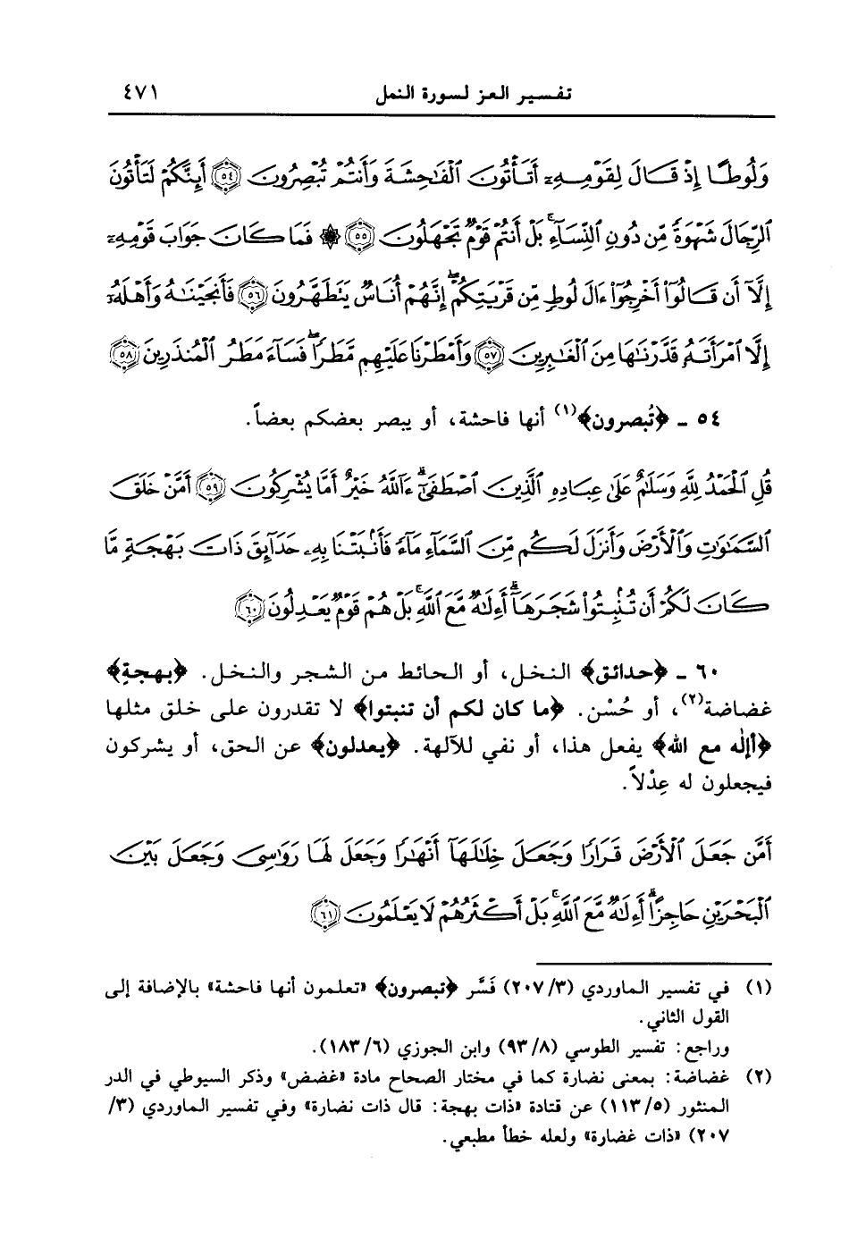 54 - {تُبْصِرُونَ} أنها فاحشة، أو يبصر بعضكم بعضاً. {قل الحمد لله وسلام على عباده الذين اصطفىءالله خيرٌ أما يشركون أمّن خلق السموات والأرض وأنزل لكم من السماء ماءً فأنبتنا به حدائق ذات بهجةٍ ما كان لكم أن تنبتوا شجرها أءلةٌ مع الله بل هم قومٌ يعدلون}