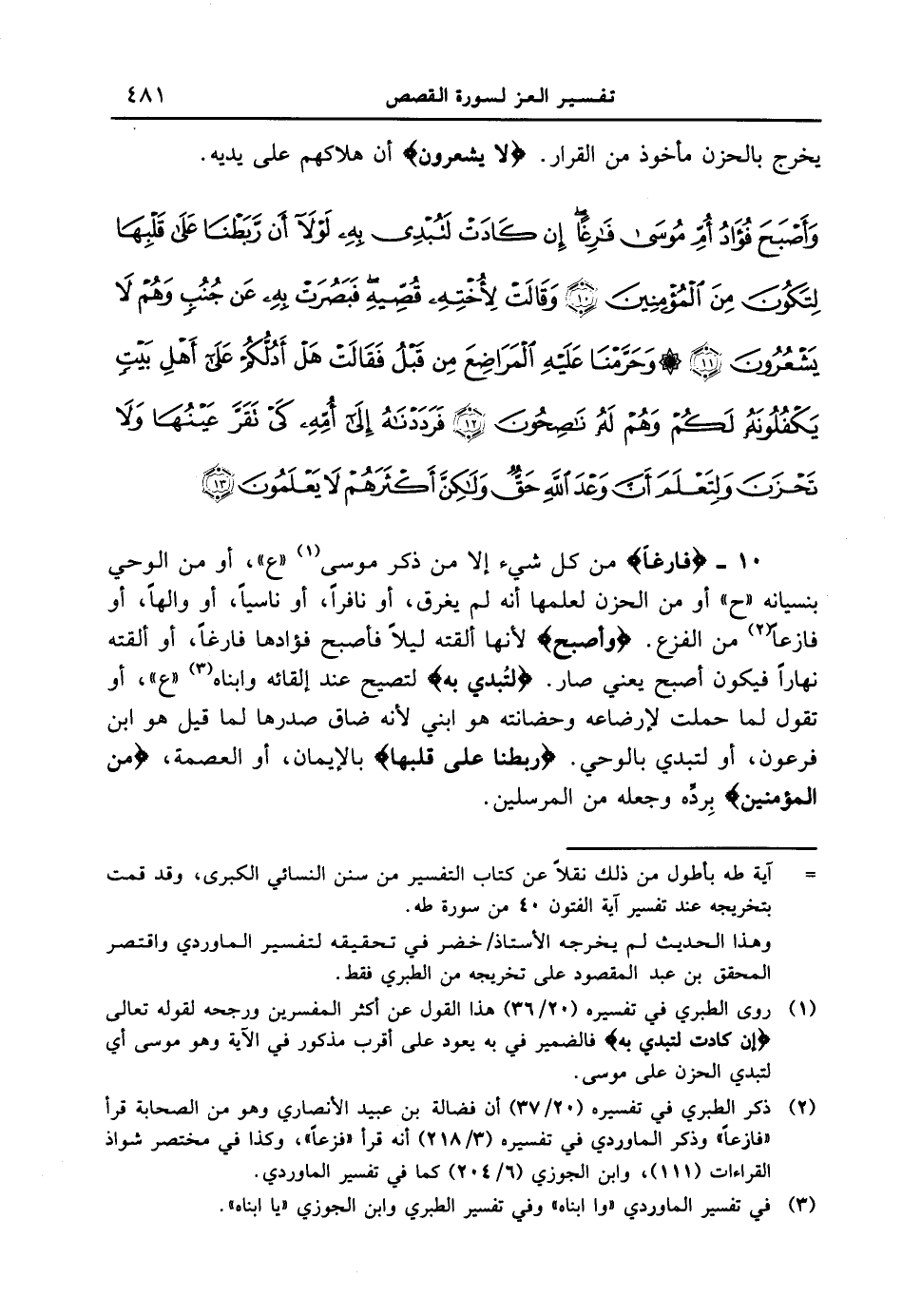 10 - {فَارِغاً} من كل شيء إلا من ذكر موسى " ع "، أو من الوحي بنسيانه " ح " أو من الحزن لعلمها أنه لم يغرق، أو نافراً، أو ناسياً، أو والهاً، أو فازعاً من الفزع. {وَأَصْبَحَ} لأنها ألقته ليلاً فأصبح فؤادها فارغاً، أو ألقته نهاراً فيكون أصبح يعني صار. {لَتُبْدِى به} لتصيح به عند إلقائه وابناه " ع "، أو تقول لما حملت لإرضاعه وحضانته هو ابني لأنه ضاق صدرها لما قيل هو ابن فرعون، أو لتبدي بالوحي. {رَّبَطْنَا عَلَى قَلْبِهَا} بالإيمان، أو العصمة، {مِنَ الْمُؤْمِنِينَ} بِردِّه وجعله من المرسلين.
