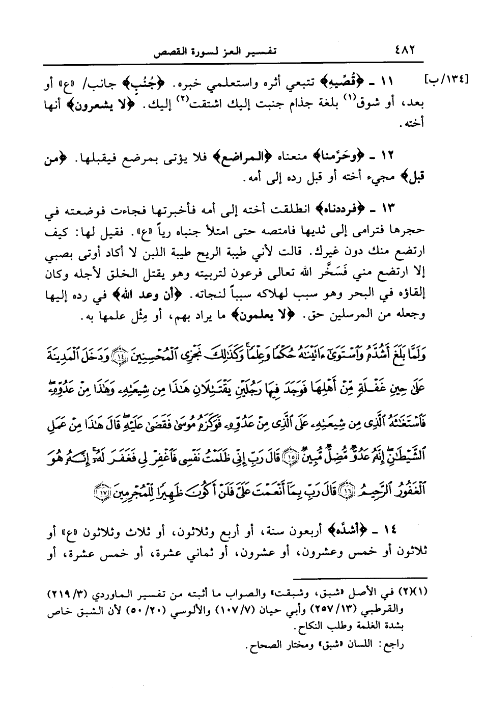 13 - {فَرَدَدْنَاهُ} انطلقت أخته إلى أمه فأخبرتها فجاءت فوضعته في حجرها فترامى إلى ثديها فامتصه حتى امتلأ جنباه رياً " ع ". فقيل لها: كيف ارتضع منك دون غيرك. قالت لأني طيبة الريح طيبة اللبن لا أكاد أوتى بصبي إلا ارتضع مني فَسَخَّر الله تعالى فرعون لتربيته وهو يقتل الخلق لأجله وكان إلقاؤه في البحر وهو سبب لهلاكه سبباً لنجاته. {أَنَّ وَعْدَ اللَّهِ} في رده إليها وجعله من المرسلين حق. {لا يَعْلَمُونَ} ما يراد بهم. أو مثل علمها به. {ولمّا بلغ أشدّه واستوىءاتيناه حكماً وعلماً وكذلك نجزي المحسنين 14 ودخل المدينة على حين غفلةٍ من أهلها فوجد فيها رجلين يقتتلان هذا من شيعته وهذا من عدوه فاستغاثاه الذي من شيعته على الذي من عدوّه فوكزه موسى فقضى عليه قال هذا من عمل الشيطان إنّه عدوٌّ مضلٌّ مبين قال رب إني ظلمت نفسي فاغفر لي فغفر له إنّه هو الغفور الرحيم قال ربّ بما أنعمت علىّ فلن أكون ظهيراً للمجرمين}