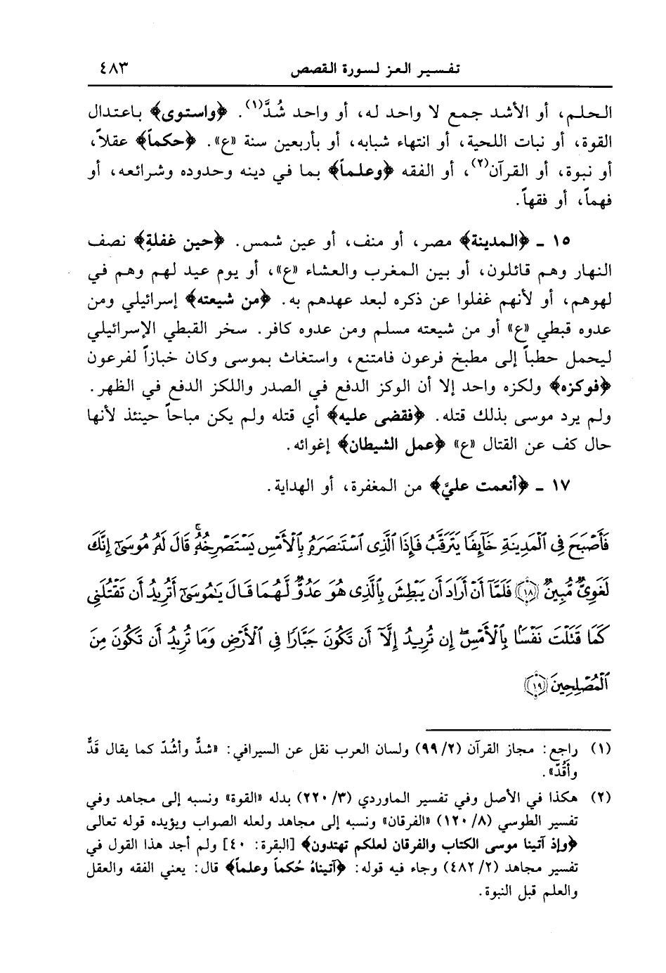 15 - {الْمَدِينَةَ} مصر، أو منف، أو عين شمس. {حِينِ غَفْلَةٍ} نصف النهار وهم قائلون، أو بين المغرب والعشاء " ع "، أو يوم عيد لهم وهم في لهوهم، أو لأنهم غفلوا عن ذكره لبعد عهدهم به {مِن شِيعَتِهِ} إسرائيلي ومن عدوه قبطي " ع " أو من شيعته مسلم ومن عدوه كافر. سخر القبطي الإسرائيلي ليحمل حطباً إلى مطبخ فرعون فامتنع، واستغاث بموسى وكان خبازاً لفرعون {فَوَكَزَهُ} ولكزه واحد إلا أن الوكز الدفع في الصدر واللكز الدفع في الظهر. ولم يرد موسى بذلك قتله. {فَقَضَى عَلَيْهِ} أي قتله ولم يكن مباحاً حينئذ لأنها حال كف عن القتال " ع " {عَمِلِ الشَّيْطَانِ} إغوائه.