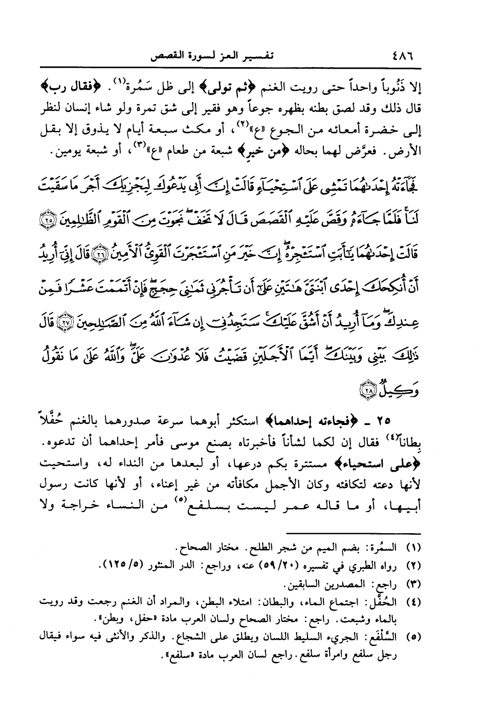25 - {فَجَآءَتْهُ إِحْدَاهُمَا} استكثر أبوهما سرعة صدورهما بالغنم حُفَّلاً بِطاناً فقال إن لكما لشأناً فأخبرتاه بصنع موسى فأمر أحداهما أن تدعوه. {عَلَى اسْتِحْيَآءٍ} مستترة بكم درعها، أو لبعدها من النداء له، واستحيت لأنها دعته لتكافئه وكان الأجمل مكافأته من غير إعناء، أو لأنها كانت رسول أبيها، أو ما قاله عمر ليست بسلفع من النساء خراجة ولا