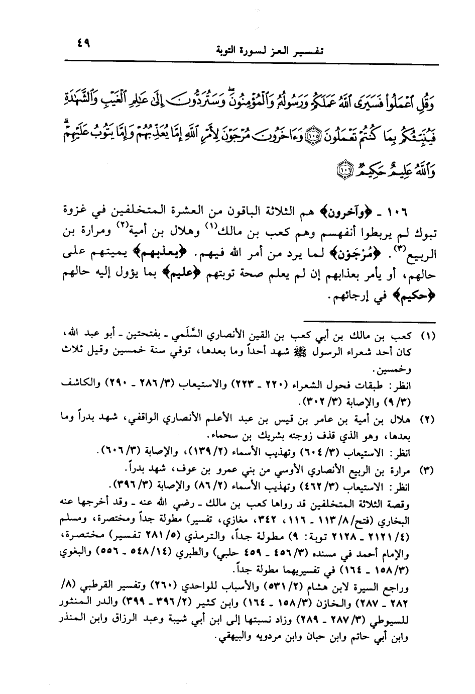106 - {وآخرون} هم الثلاثه الباقون من العشرة المتخلفين في غزوة تبوك لم يربطوا أنفسهم وهم كعب بن مالك وهلال بن أمية ومرارة بن الربيع. {مُرْجَوْنَ} لما يرد من أمر الله فيهم. {ليعذبهم} يميتهم على حالهم، أو يأمر بعذابهم إن لم يعلم صحة توبتهم {عَلِيمٌ} بما يؤول إليه حالهم، {حَكِيمٌ} في إرجائهم.