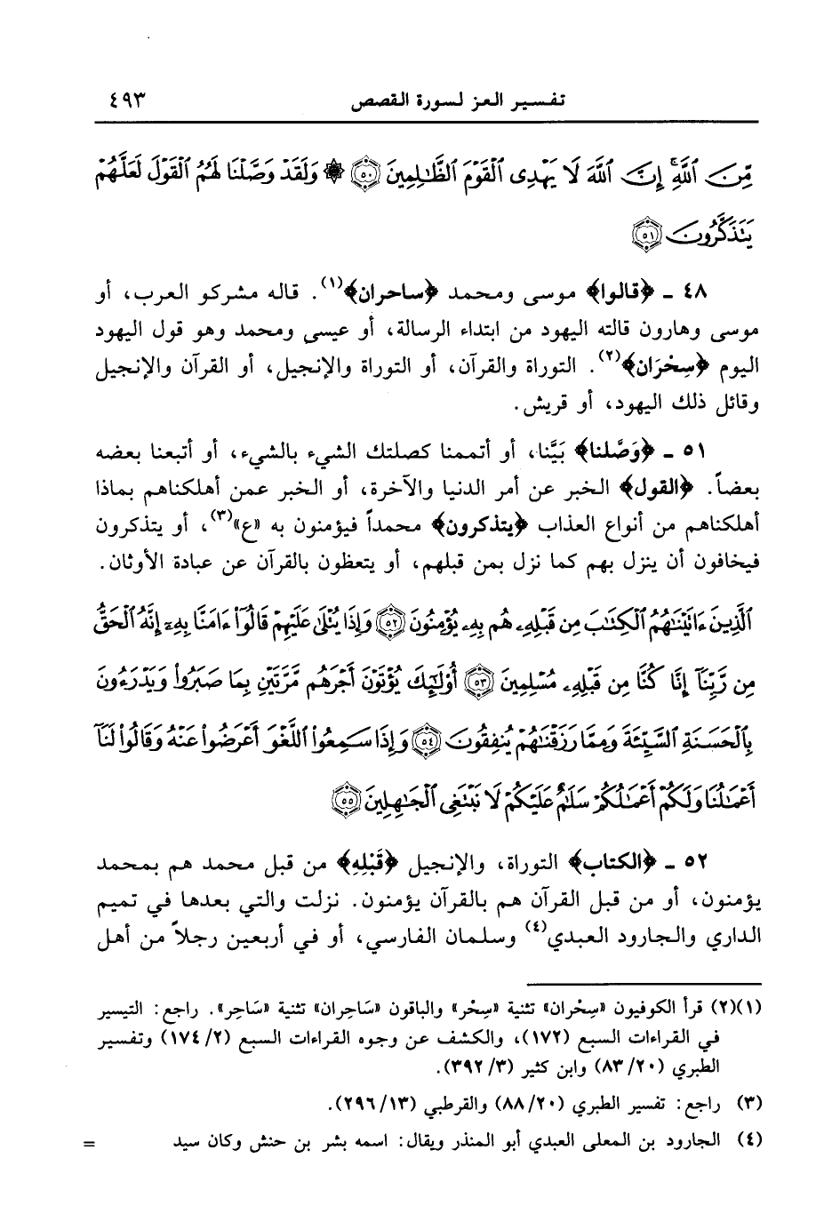 52 - {الْكِتَابَ) {التوراة والإنجيل} (قَبْلِهِ} من قبل محمد هم بمحمد يؤمنون، أو من قبل القرآن هم بالقرآن يؤمنون. نزلت والتي بعدها في تميم الداري والجارود العبدي وسلمان الفارسي، أو في أربعين رجلاً من أهل