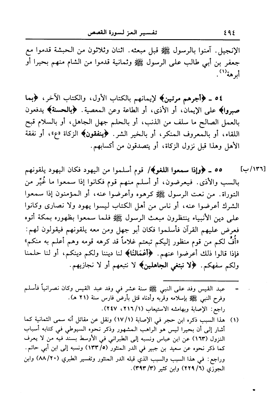 54 - {أَجْرَهُمْ مَّرَّتَيْنِ} لإيمانهم بالكتاب الأول، والكتاب الآخر، {بِمَا صَبَرُواْ} على الإيمان، أو الأذى أو الطاعة وعن المعصية {بِالْحَسَنَةِ} يدفعون بالعمل الصالح ما سلف من الذنب، أو بالحلم جهل الجاهل، أو بالسلام قبح اللقاء، أو بالمعروف المنكر، أو بالخير الشر. {يُنفِقُونَ} الزكاة " ع "، أو نفقة الأهل وهذا قبل نزول الزكاة، أو يتصدقون من أكسابهم.