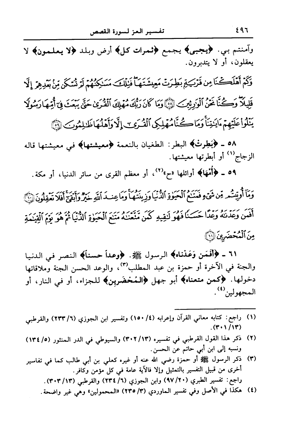 59 - {أُمِّهَا} أوائلها " ح "، أو معظم القرى من سائر الدنيا، أو مكة. {وما أوتيتم من شىءٍ فمتاع الحياة الدنيا وزينتها وما عند الله خيرٌ وأبقى أفلا تعقلون أفمن وعدناه وعداً حسناً فهو لاقيه كمن متعناه متاع الحياة الدنيا ثم هو يوم القيامة من المحضرين}