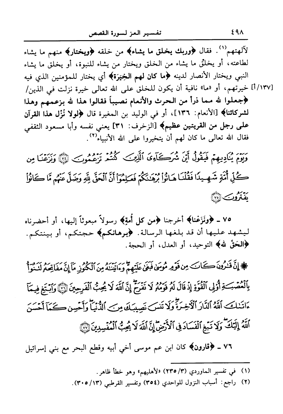 75 - {وَنَزَعْنَا} أخرجنا {مِن كُلِّ أُمَّةٍ} رسولاً مبعوثاً إليها، أو أحضرناه ليشهد عليها أن قد بلغها الرسالة. {بُرْهَانَكُمْ} حجتكم، أو بينتكم. {الْحَقَّ لِلَّهِ} التوحيد، أو العدل، أو الحجة. {إن قارون كان من قوم موسى فبغى عليهم وءاتيناه من الكنوز ما إن مفاتحه لتنوأ بالعصبة أولى القوة إذ قال له قومه لا تفرح إن الله لا يحب الفرحين وابتغ فيما ءاتاك الله الدار الآخرة ولا تنس نصيبك من الدنيا وأحسن كما أحسن الله إليك ولا تبغ الفساد في الأرض إن الله لا يحب المفسدين 77}