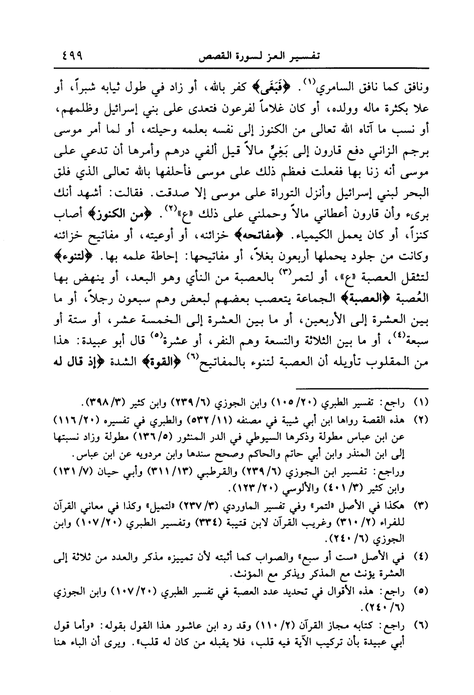 ونافق كما نافق السامري. {فَبَغَى} كفر بالله، أو زاد في طول ثيابه شبراً، أو علا بكثرة ماله وولده، أو كان غلاماً لفرعون فتعدى على بني إسرائيل وظلمهم، أو نسب ما أتاه الله تعالى من الكنوز إلى نفسه بعلمه وحيلته، أو لما أمر موسى برجم الزاني دفع قارون إلى بَغِيٍّ مالاً قيل ألفي درهم وأمرها أن تدعي على موسى أنه زنا بها ففعلت فعظم ذلك على موسى فأحلفها بالله تعالى الذي فلق البحر لبني إسرائيل وأنزل التوراة على موسى إلا صدقت. فقالت: أشهد أنك برىء وأن قارون أعطاني مالاً وحملني على ذلك " ع " {مِنَ الْكُنُوزِ} أصاب كنزاً، أو كان يعمل الكيمياء {مَفَاتِحَهُ} خزائنه، أو أوعيته، أو مفاتيح خزائنه وكانت من جلود يحملها أربعون بغلاً، أو مفاتيحها: إحاطة علمه بها. {لتنوء} لتثقل العصبة " ع "، أو لتمر بالعصبة من النأي وهو البعد، أو ينهض بها العُصبة {العصبة} الجماعة يتعصب بعضهم لبعض مهم سبعون رجلاً، أو ما بين العشرة إلى الأربعين، أو ما بين العشرة إلى الخمسة عشر، أو ستة أو سبعة، أو ما بين الثلاثة والتسعة وهم النفر، أو عشرة قال أبو عبيدة: هذا من المقلوب تأويله أن العصبة لتنوء بالمفاتيح {الْقُوَّةِ} الشدة {إِذْ قال له