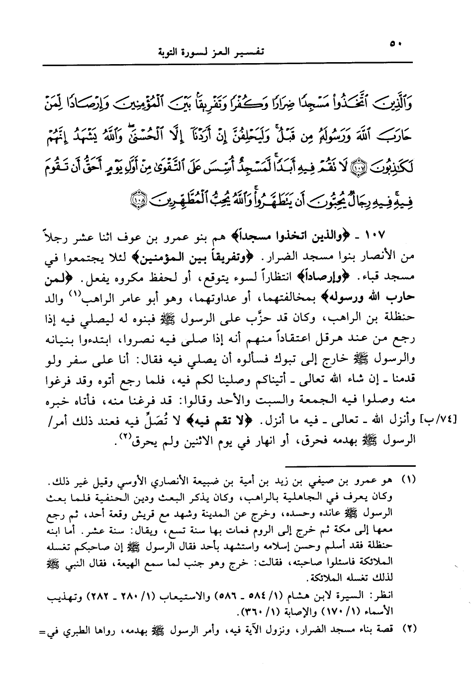 107 - {وَالِّذِينَ اتَّخَذُواْ مَسْجِداً} هم بنو عمرو بن عوف اثنا عشر رجلاً من الأنصار بنوا مسجد الضرار. {وَتَفْرِيقَا بَيْنَ الْمُؤْمِنِينَ} لئلا يجتمعوا في مسجد قباء. {وَإِرْصَادًا} انتظاراً لسوء يتوقع، أو لحفظ مكروه يفعل. {لِّمَنْ حَارَبَ اللَّهَ وَرَسُولَهُ} بمخالفتهما، أو عداوتهما، وهو أبو عامر الراهب والد حنظلة بن الراهب، وكان قد حزب على الرسول [صلى الله عليه وسلم] فبنوه له ليصلي فيه إذا رجع من عند هرقل اعتقاداً منهم أنه إذا صلى فيه نصروا، ابتدءوا بنيانه والرسول [صلى الله عليه وسلم] خارج إلى تبوك فسألوه أن يصلي فيه فقال: أنا على سفر ولو قدمنا - إن شاء الله تعالى - أتيناكم وصلينا لكم فيه، فلما رجع أتوه وقد فرغوا منه وصلوا فيه الجمعة والسبت والأحد وقالوا: قد فرغنا منه، فأتاه خبره وأنزل الله - تعالى - فيه ما أنزل. {لا تَقُمْ فِيهِ} لا تُصَلِّ فيه فعند ذلك أمر / [74 / ب] الرسول [صلى الله عليه وسلم] بهدمه فحُرق، أو انهار في يوم الأثنين ولم يحرق.
