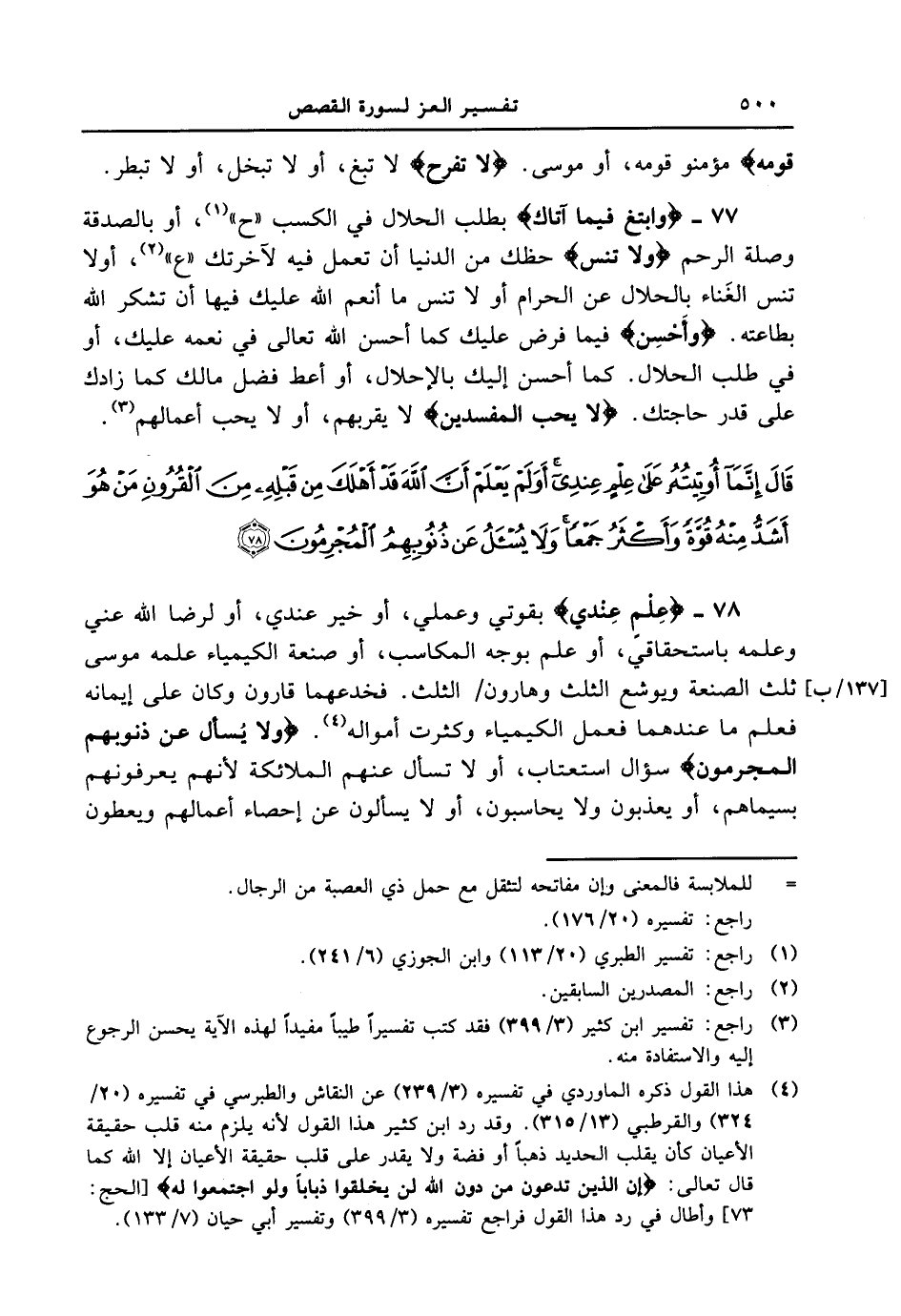 78 - {عِلْمٍ عِندِى} بقوتي وعملي، أو خير عندي، أو لرضا الله عني وعلمه باستحقاقي، أو علم بوجه المكاسب، أو صنعه الكيمياء علمه موسى ثلث الصنعة ويوشع الثلث وهارون / [137 / ب] الثلث. فخدعهما قارون وكان على إيمانه فعلم ما عندهما فعمل الكيمياء وكثرت أمواله. {ولا يسأل عَن ذُنُوبِهِمُ الْمُجْرِمُونَ} سؤال استعتاب، أو لا تسأل عنهم الملائكة لأنهم يعرفونهم بسيماهم، أو يعذبون ولا يحاسبون، أو لا يسألون عن إحصاء أعمالهم ويعطون