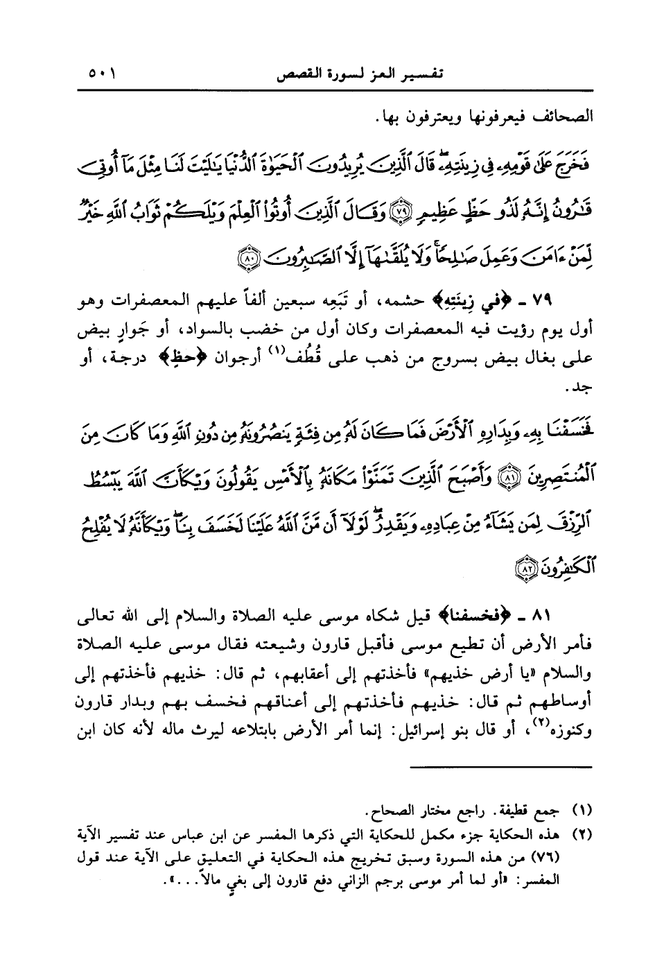 79 - {فِى زِينَتِهِ} حشمه، أو تَبَعِه سبعين ألفاً عليهم المعصفرات وهو أول يوم رؤيت فيه المعصفرات وكان أول من خضب بالسواد، أو جَوارٍ بيض على بغال بيض بسروج من ذهب على قُطُف أرجوان {حظ} درجة، أو جد. {فخسفنا به وبداره الأرض فما كان له من فئة ينصرونه من دون الله وما كان من المنتصرين وأصبح الذين تمنوا مكانه بالأمس يقولون ويكأن الله يبسط الرزق لمن يشاء من عباده ويقدر لولا أن من الله علينا لخسف بنا ويكأنه لا يفلح الكافرون}