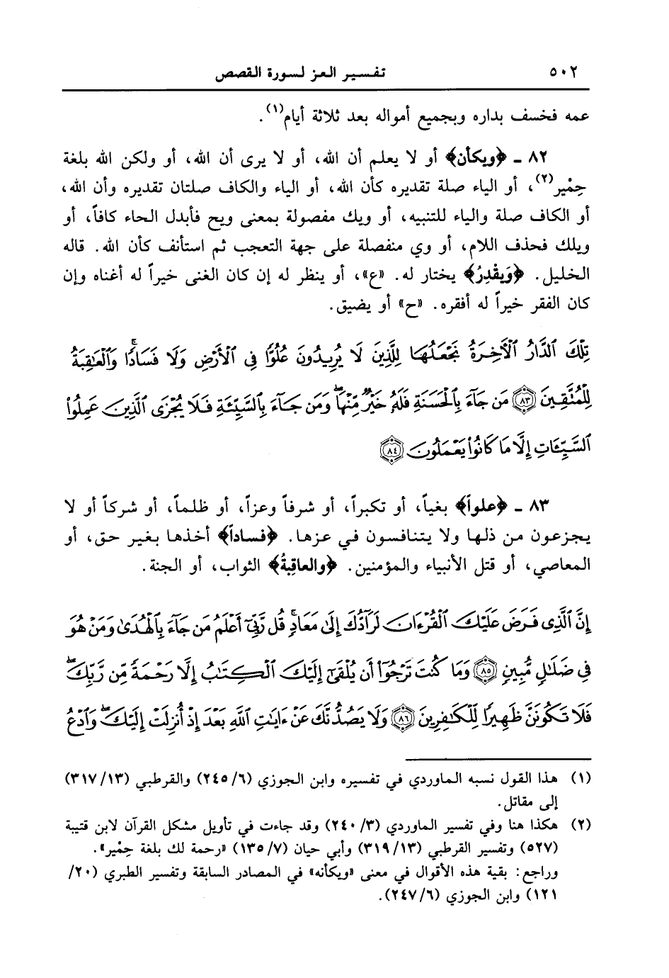 82 - {وَيْكَأَنَّ} أو لا يعلم أن الله، أو لا يرى أن الله، أو ولكن الله بلغة حمير، أو الياء صلة تقديره كأن الله، أو الياء والكاف صلتان تقديره وأن الله، أو الكاف صلة والياء للتنبيه، أو ويك مفصولة بمعنى ويح فأبدل الحاء كافاً، أو ويلك فحذف اللام، أو وي منفصلة على جهة التعجب ثم استأنف كأن الله. قاله الخليل. {وَيَقْدِرُ} يختار له. " ع "، أو ينظر له إن كان الغنى خيراً له أغناه وإن كان الفقير خيراً له أفقره. " ح " أو يضيق. {تلك الدّار الأخرة نجعلها للذين لا يردون علوّا فى الأرض ولا فساداً والعاقبة للمتّقين من جآء بالحسنة فله خيرٌ منها ومن جآء بالسّيئة فلا يجزى الذين عملوا السّيئات إلا ما كانوا يعملون