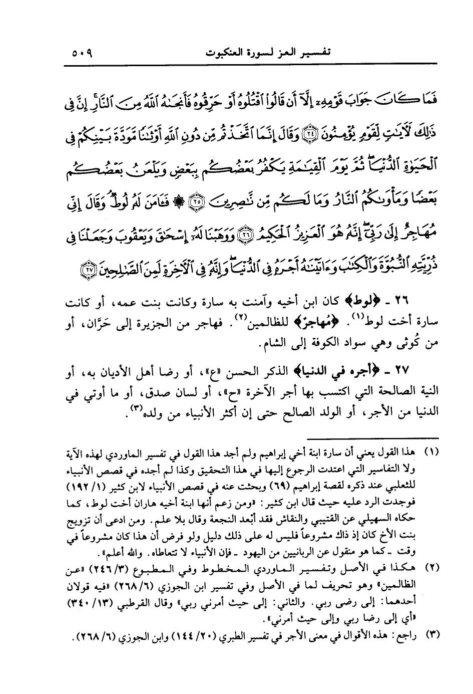 26 - {لُوطٌ} كان ابن أخيه وآمنت به سارة وكانت بنت عمه، أو كانت سارة أخت لوط. {مُهَاجِرٌ} للظالمين. فهاجر من الجزيرة إلى حَرَّان، أو من كوثى وهي سواد الكوفة إلى الشام.