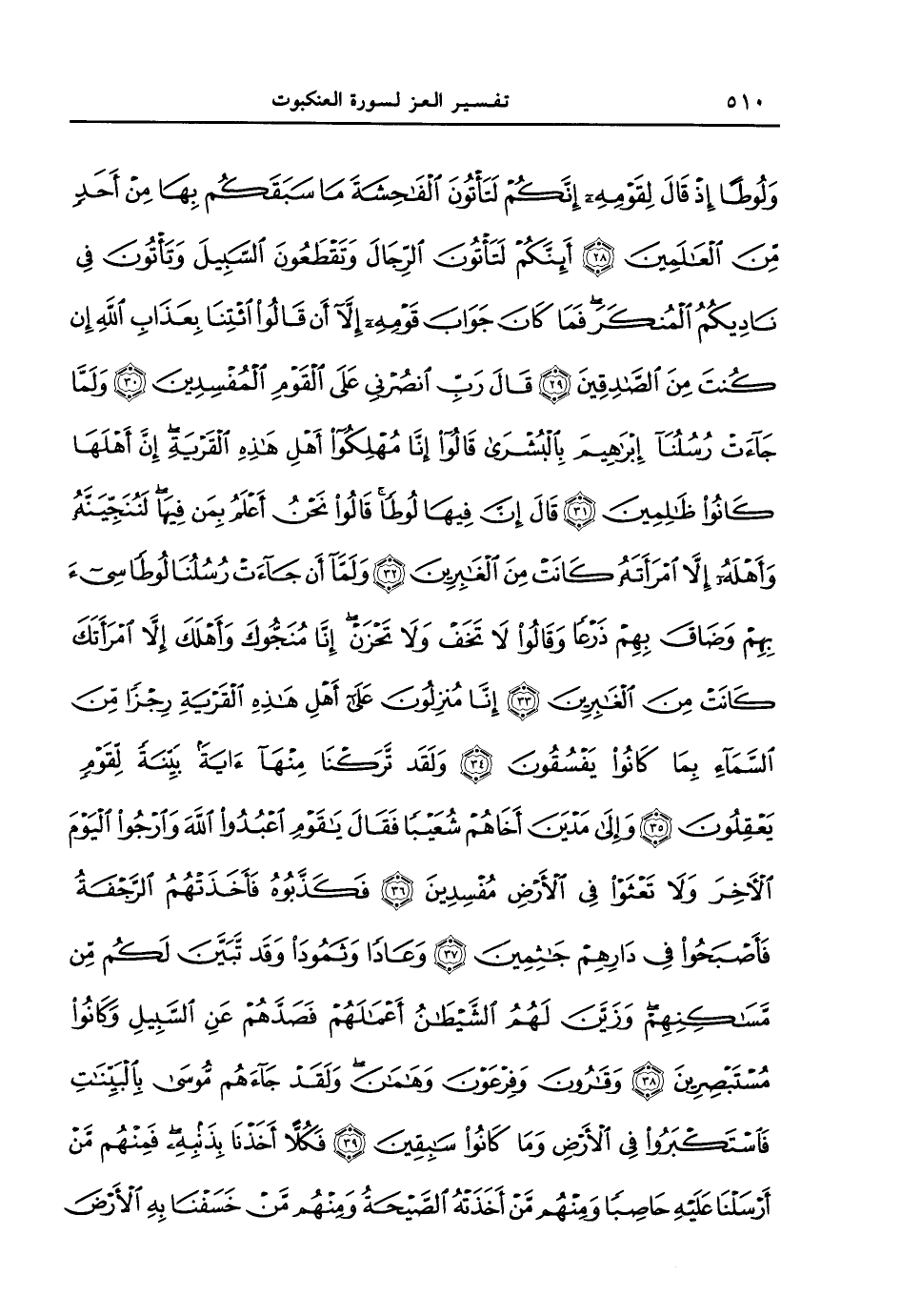 {ولوطاً إذا قال لقومه إنّكم لتأتون الفاحشة ما سبقكم بها من أحد من العالمين إئنّكم لتأتون الرجال وتقطعون السبيل وتأتون في ناديكم المنكر فما كان جواب قومه إلا أن قالوا ائتنا بعذاب الله إن كنت من الصادقين قال رب انصرني على القوم المفسدين ولما جاءت رسلنا إبراهيم بالبشرى قالوا إنّا مهلكوا أهل هذه القرية إن أهلها كانوا ظالمين قال إن فيها لوطاً قالوا نحن أعلم بمن فيها لننجينه وأهله إلا امرأته كانت من الغابرين ولما أن جاءت رسلنا لوطاً سىءَ بهم وضاق بهم ذرعاً وقالوا لا تخف ولا تحزن إنّا منجّوك وأهلك إلا امرأتك كانت من الغابرين إنّا منزلون على أهل هذه القرية رجزاً من السماء بما كانوا يفسقون ولقد تركنا منها ءاية بينةً لقومٍ يعقلون وإلى مدين أخاهم شعيباً فقال يا قوم اعبدوا الله وارجوا اليوم الآخر ولا تعثوا في الأرض مفسدين فكذّبوه فأخذتهم الرّجفة فأصبحوا في دارهم جاثمين وعاداً وثموداً وقد تبين لكم من مساكنهم وزين لهم الشيطان أعمالهم فصدهم عن السبيل وكانوا مستبصرين وقارون وفرعون وهامان ولقد جاءهم موسى بالبينات فاستكبروا في الأرض وما كانوا سابقين فكلاًّ أخذنا بذنبه فمنهم من أرسلنا عليه حاصباً ومنهم من أخذته الصيحة ومنهم من خسفنا به الأرض