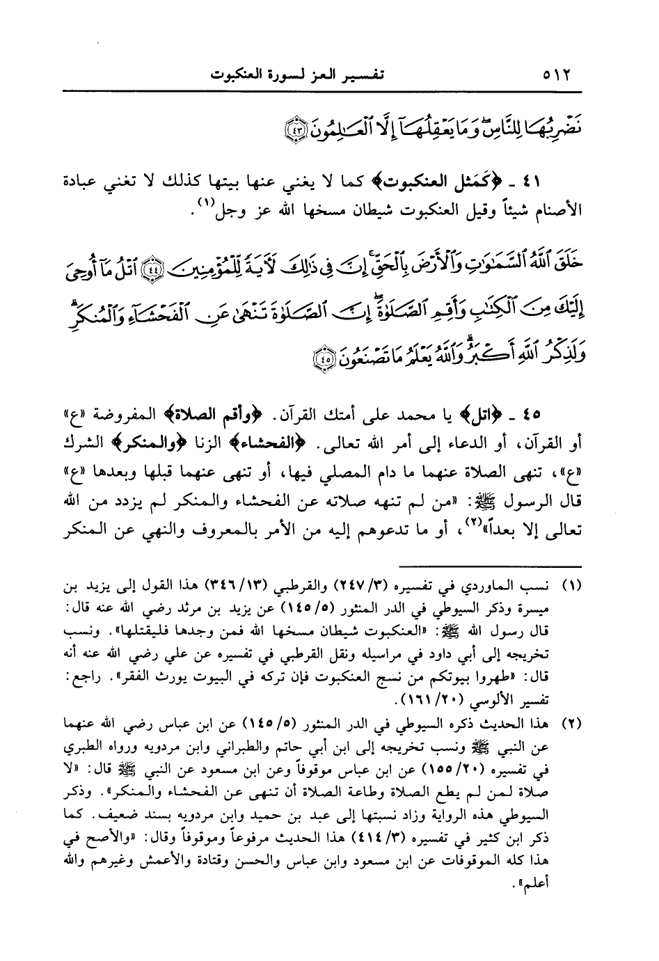 41 - {كَمَثَلِ الْعَنكَبُوتِ} كما لا يغني عنها بيتها كذلك لا تغني عبادة الأصنام شيئاً وقيل العنكبوت شيطان مسخها الله عز وجل. {خلق الله السموات والأرض بالحق إن في ذلك لآيةً للمؤمنين أتل ما أوحى إليك من الكتاب وأقم الصلاة إنّ الصلاة تنهى عن الفحشاء والمنكر ولذكر الله أكبر والله يعلم ما تصنعون}